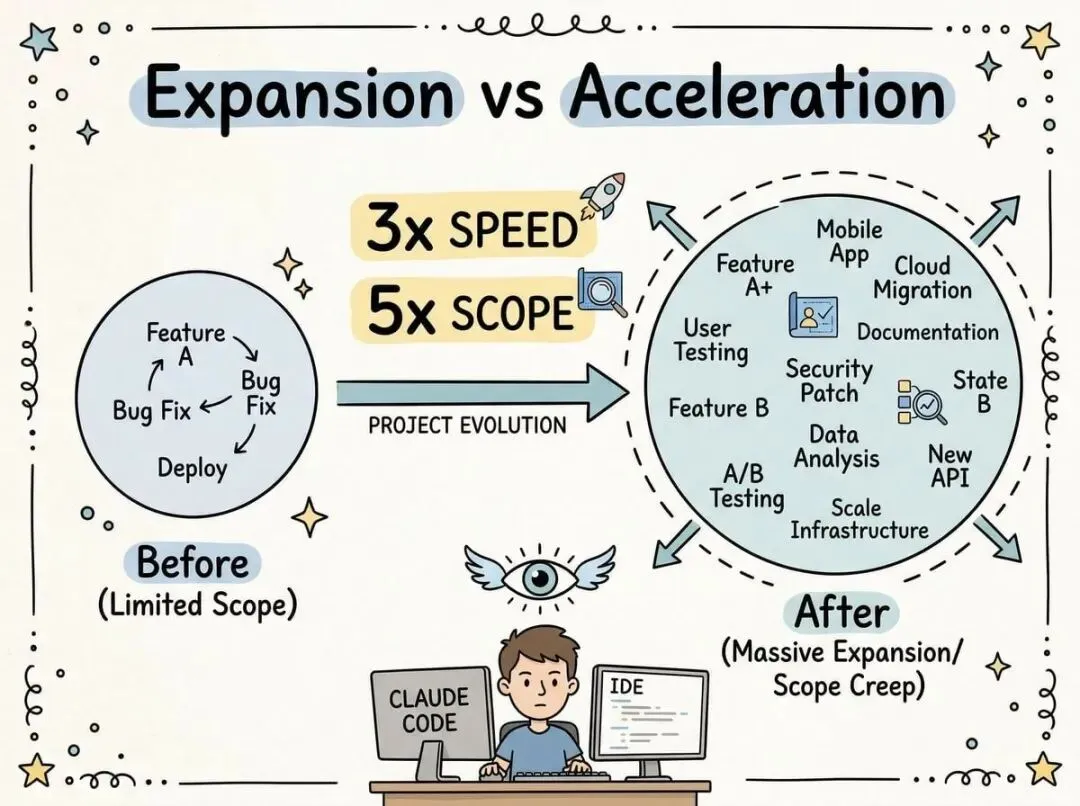 不再是写代码的地方,而是监督 Agent 的地方。你得像鹰一样盯着,看它有没有走偏。这也是为什么扩展比加速更准确,因为你的角色从“执行者”变成了“指挥者”,能管的范围自然就大了。