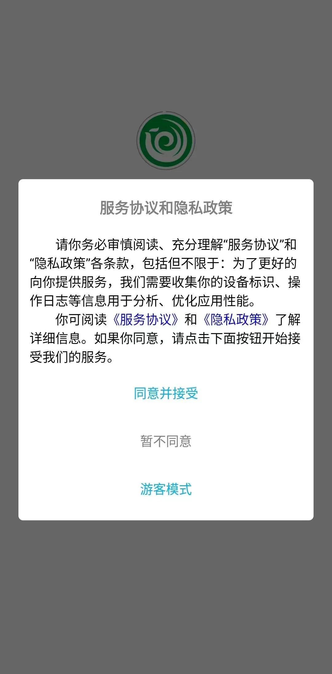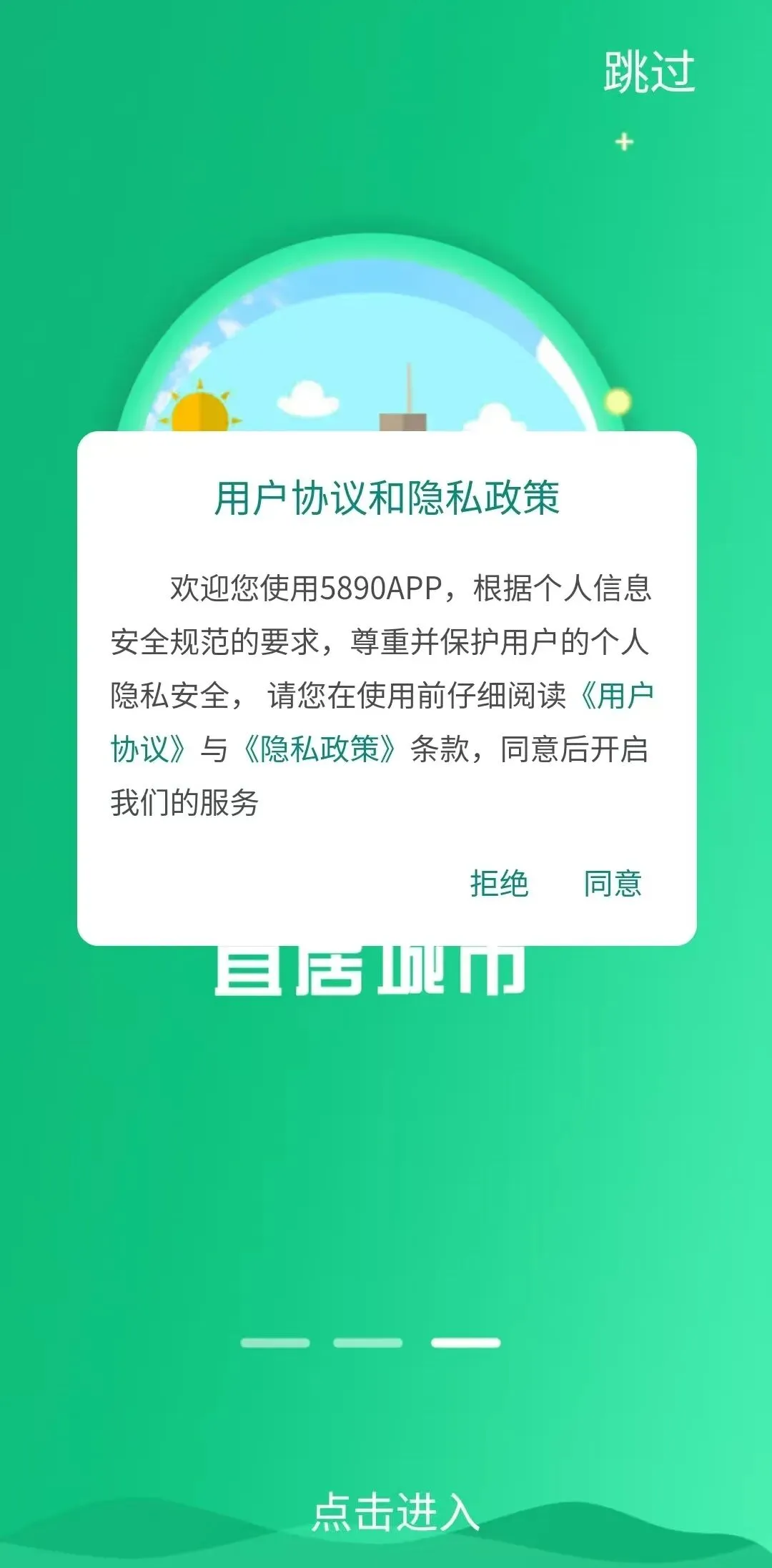 01、打开5890APP,阅读“服务协议和隐私政策”,点击“同意并接受”;阅读“用户协议和隐私政策”,点击“同意”,进入登录界面。