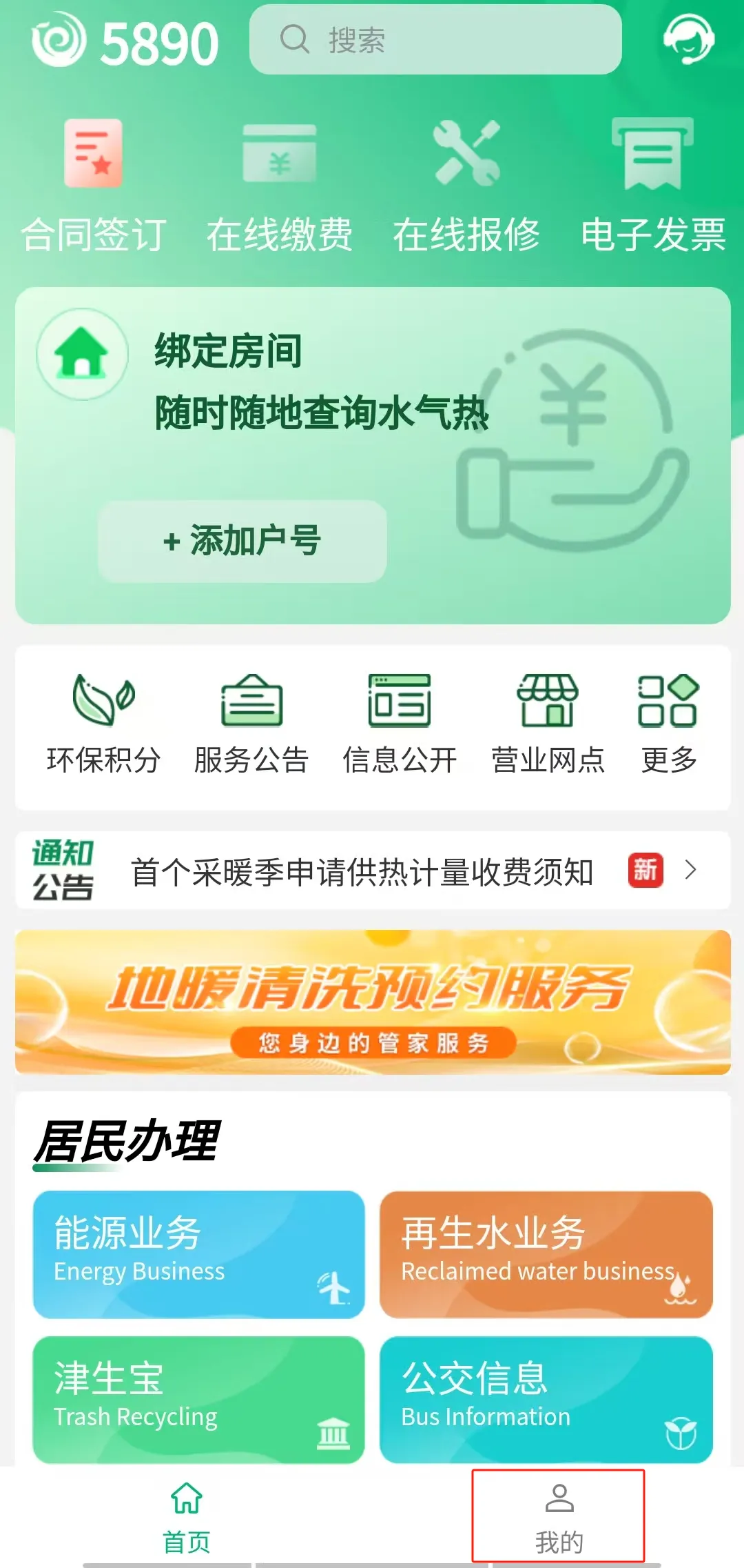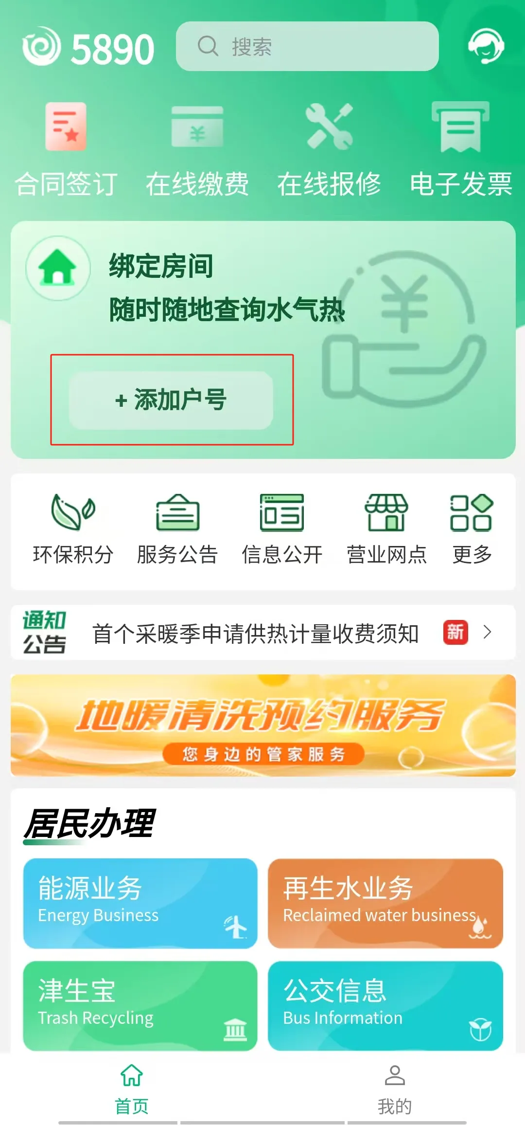 登录5890APP,点击 “添加户号”, 按操作完成房间绑定。