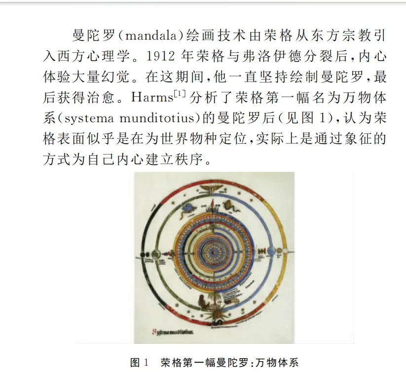 曼陀罗是梵语Mandala的音译,意思是圆轮、中心。在荣格的心理学理论中,曼陀罗被视为自我及整体个性的核心,他发现,个体绘画曼陀罗具有暗示其潜能和独特性的力量,他将曼陀罗绘画应用于自我心理治疗中并取得成功。