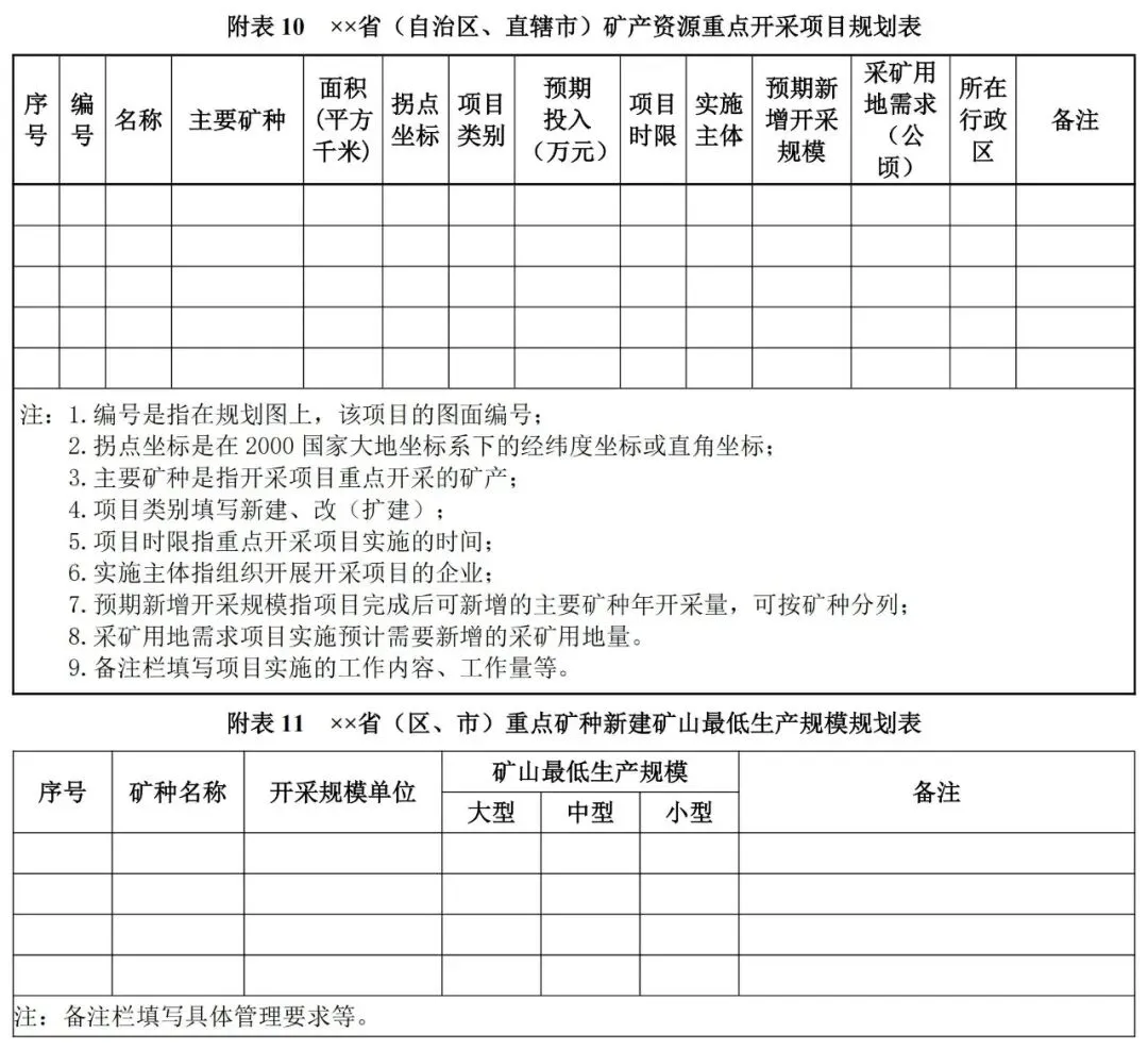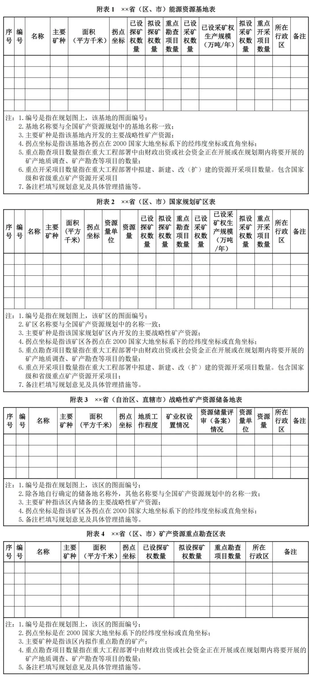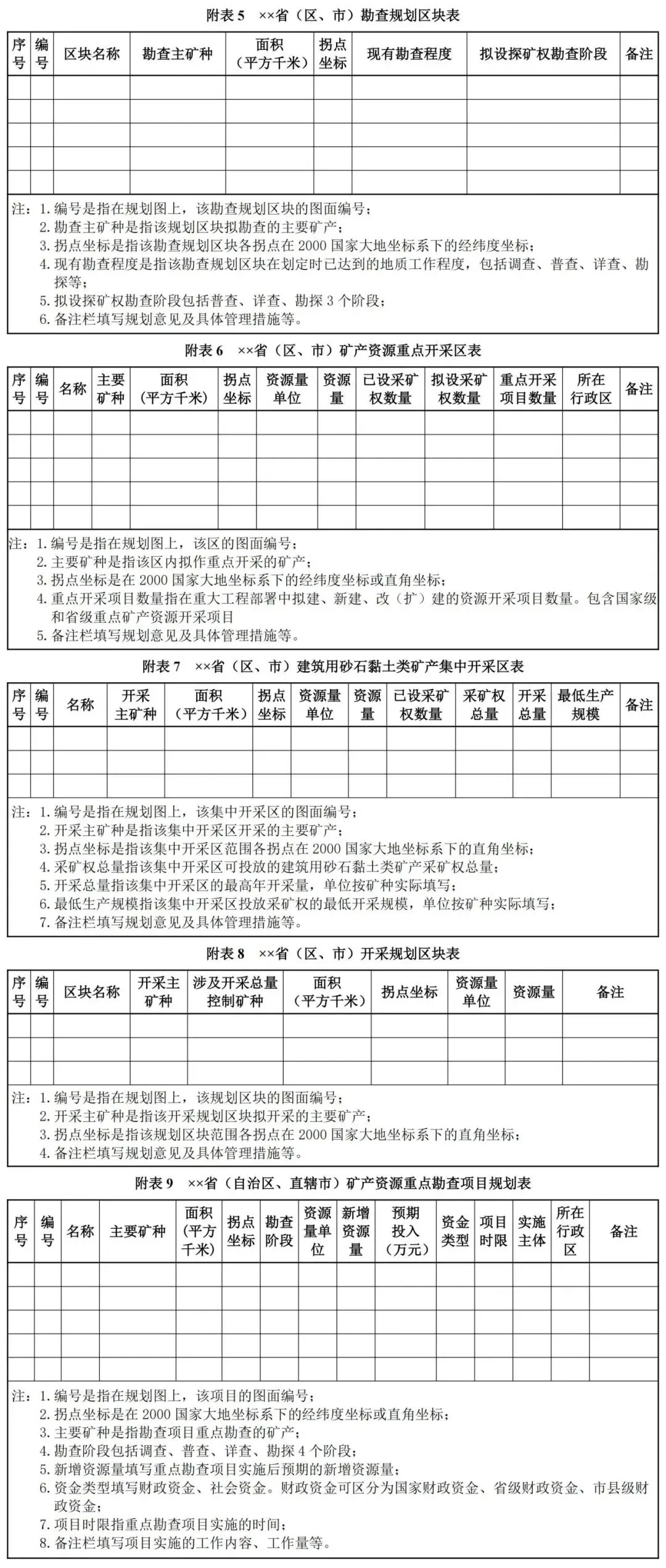 主要包括重点勘查区表、勘查规划区块表、重点开采区表、开采规划区块表、重点勘查项目表、重点开采项目表、重点矿种新建矿山最低开采规模表等,表格内容原则上与省级规划相一致,可根据需要适当增减附表项目,如增加建筑用砂石黏土类矿产集中开采区划分表等。