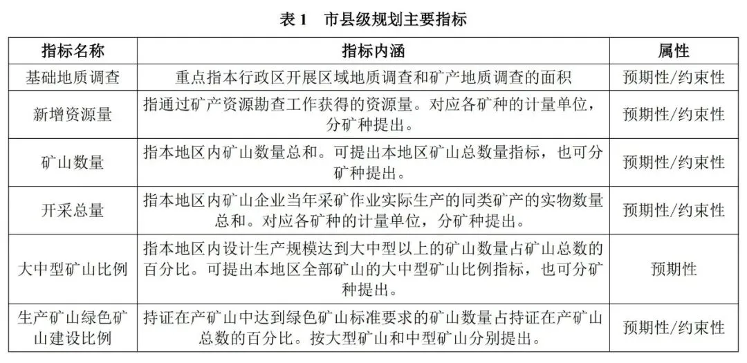 在细化落实全国矿产资源规划的指标基础上,根据管理需求,在基础地质调查、资源勘查、资源开采、结构与效率等方面,提出符合地方特色的规划指标。规划指标包括预期性和约束性两类。