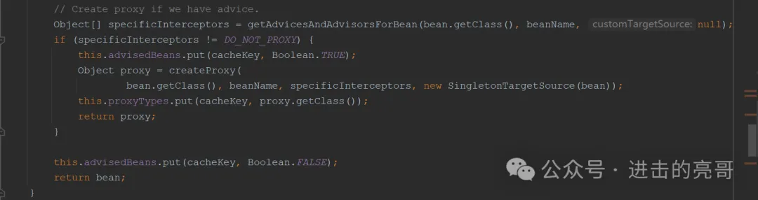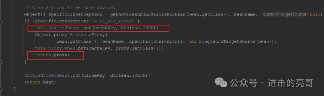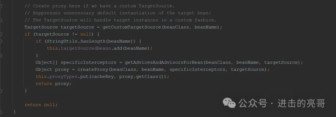 说明:分两部分,上面部分是标识无需使用代理,存储在advisedBeans中,下面部分就是创建并返回具体的代理实例,对于id=”bank”,就会执行这个流程,但是本例中targetSource是null,所以也是返回null