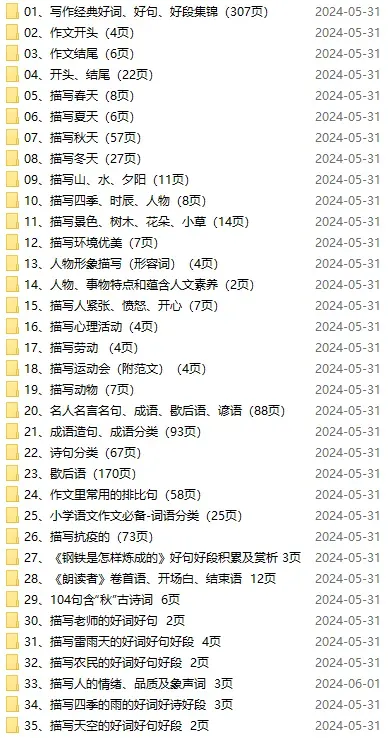 小学语文《作文素材大全》Word电子版(可下载打印)好词/好句/好段/名言/开头/结尾/描写春天/夏天/秋天/冬天/人物/动物