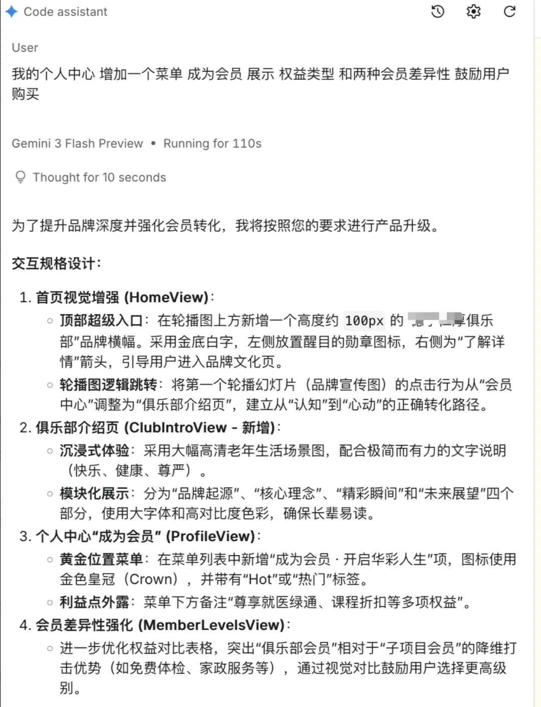 在 AiStudio 做页面设计时,我仅用自然语言说出需求:“我的个人中心,增加一个菜单,成为会员,展示权益类型和两种会员差异性,鼓励用户购买。”