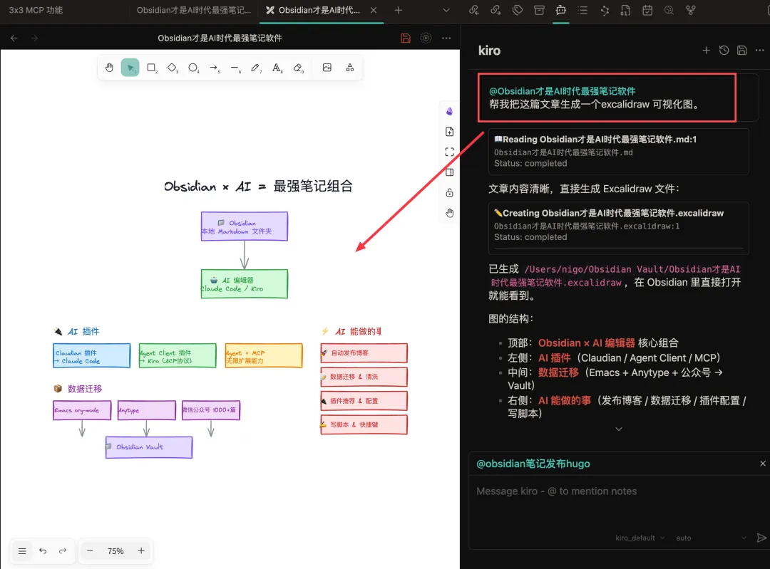 它就直接读取我指定的笔记,调用可视化绘制 excalidraw 图的 mcp ,直接帮我完成任务,