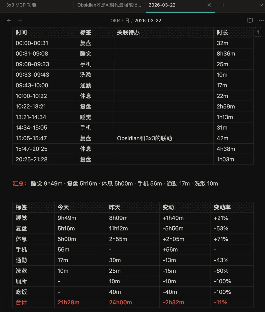 这是它读取 3×3 数据库拉取数据到当天的日记中,上面还有完成的任务(未显示),
