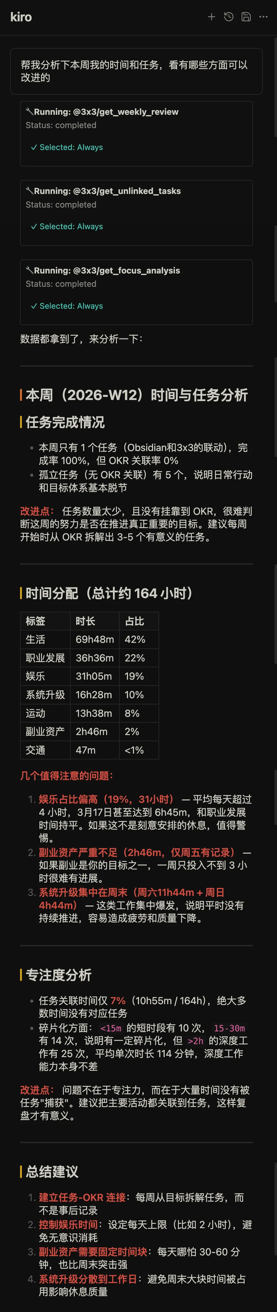 甚至我让Kiro 直接把我的需求写成了MCP ,我直接对话,它可以完成对我真实任务和时间记录的分析,