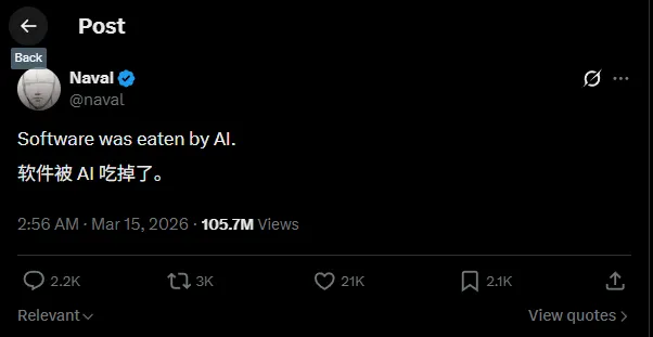 Naval Ravikant · X(原Twitter) “Software was eaten by AI.” 浏览量破亿 · 病毒式转发 · 2026年初