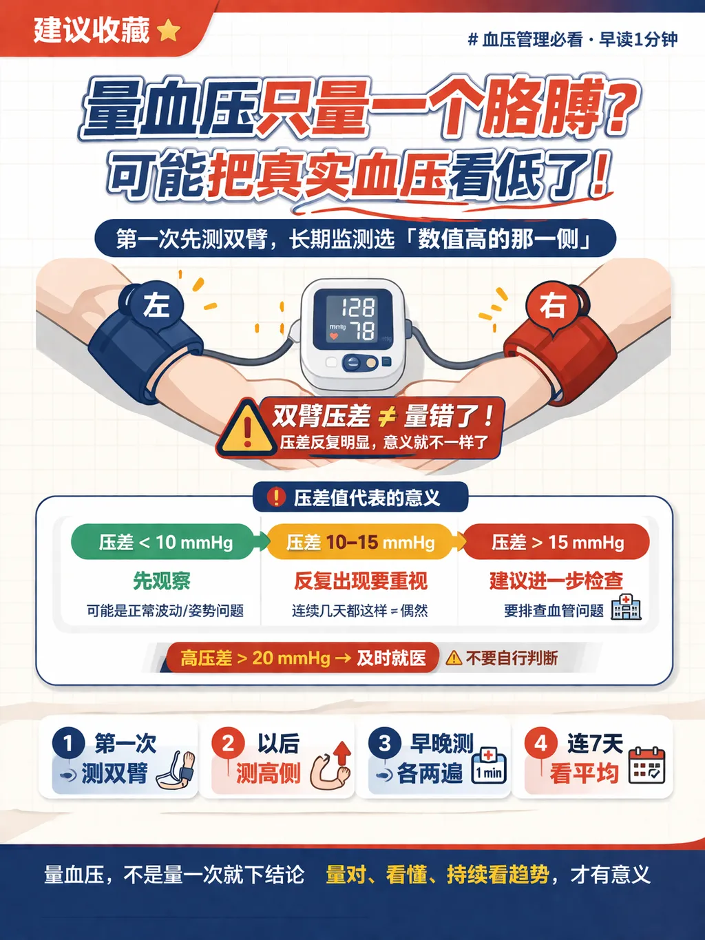 「两边都高,重点先管血压;压差明显,再留意血管。」
