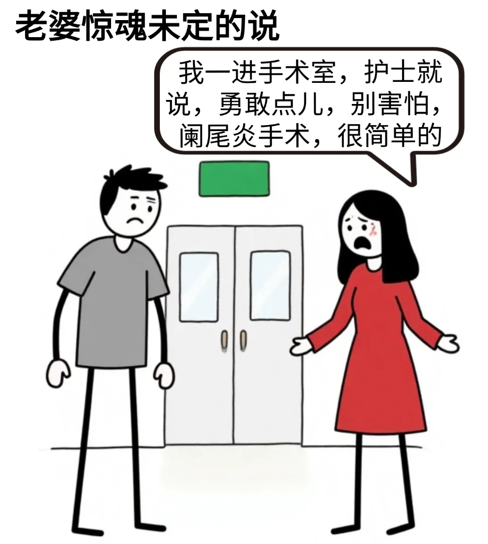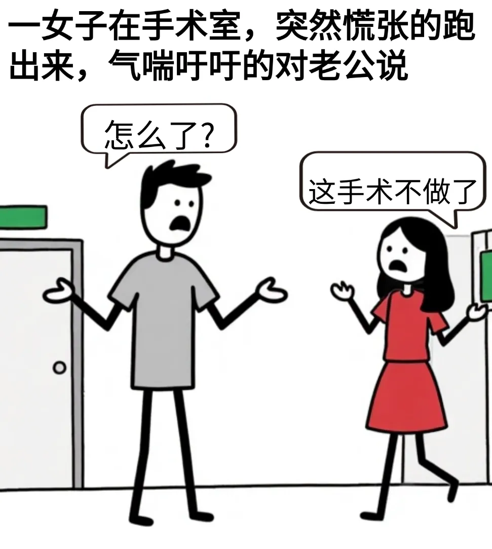 开心漫画:一女子在手术室,突然慌张的跑出来对老公说:这手术不做了,老公:怎么了?老婆:我一进手术室,护士就说勇敢点儿,别害怕…