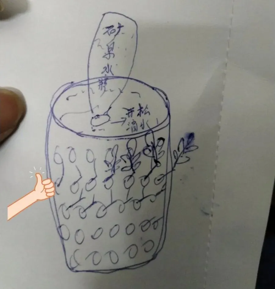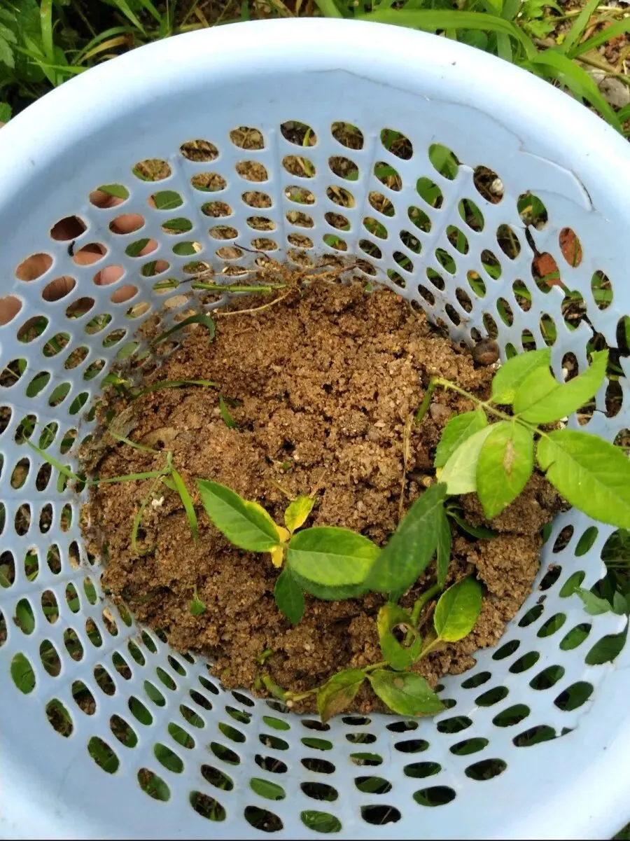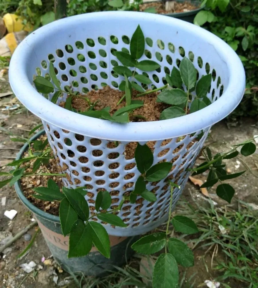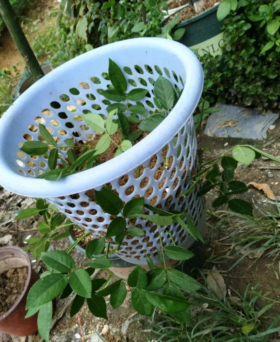 屡试屡败后,花友“恶汁够力”想到一个神器——垃圾篓,上面全是孔洞,这样足够透气了吧,洗干净装上沙土,把月季枝条插上去,试试就试试。