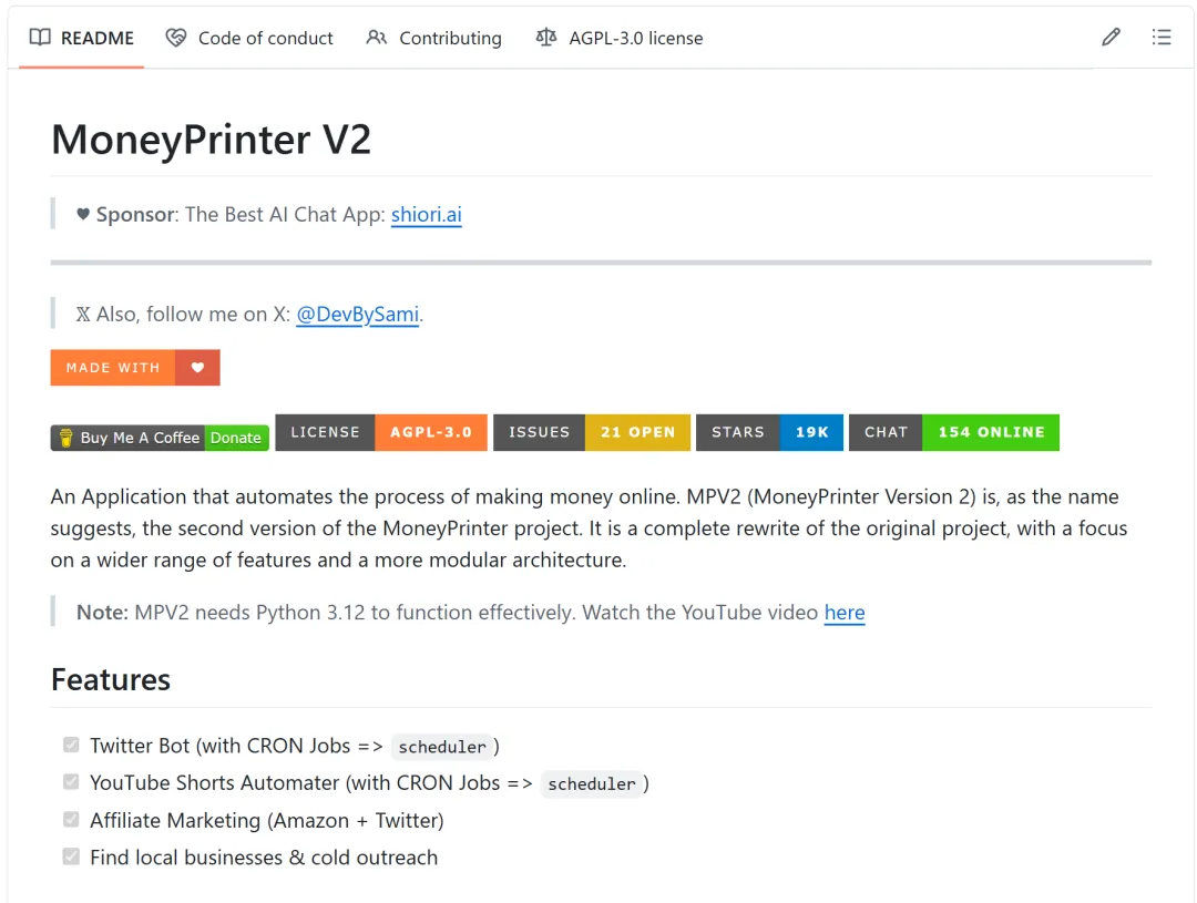 刷 GitHub,看到 MoneyPrinterV2 一天涨了 1700 多 stars。