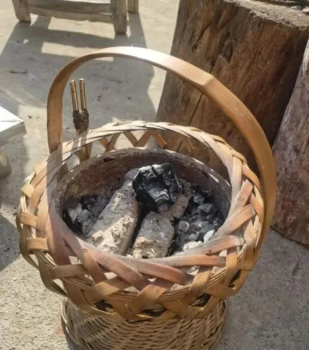 它用竹子编织而成,里面放一个耐烧的陶盆,装上炭火,就能带来阵阵暖意。