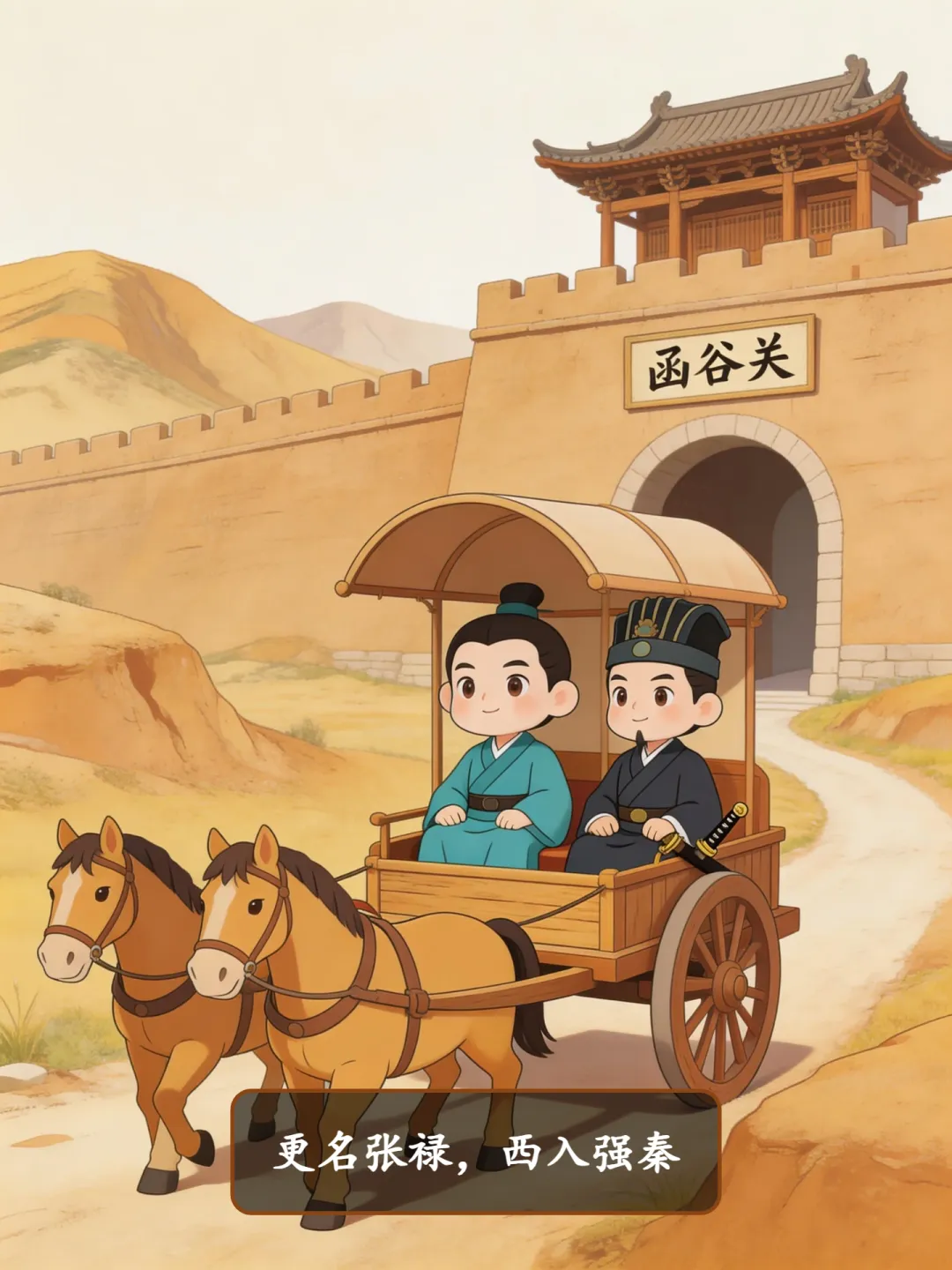 逃出来后,范雎在好友郑安平帮助下藏身,改名“张禄”。此时秦昭王派使者王稽(jī)出使魏国,郑安平设法让王稽见到范雎。王稽被其才华震惊,决定偷偷带他回秦国。他们乘车西入函谷关(今河南灵宝东北),抵达秦都咸阳(今陕西咸阳东北)。
