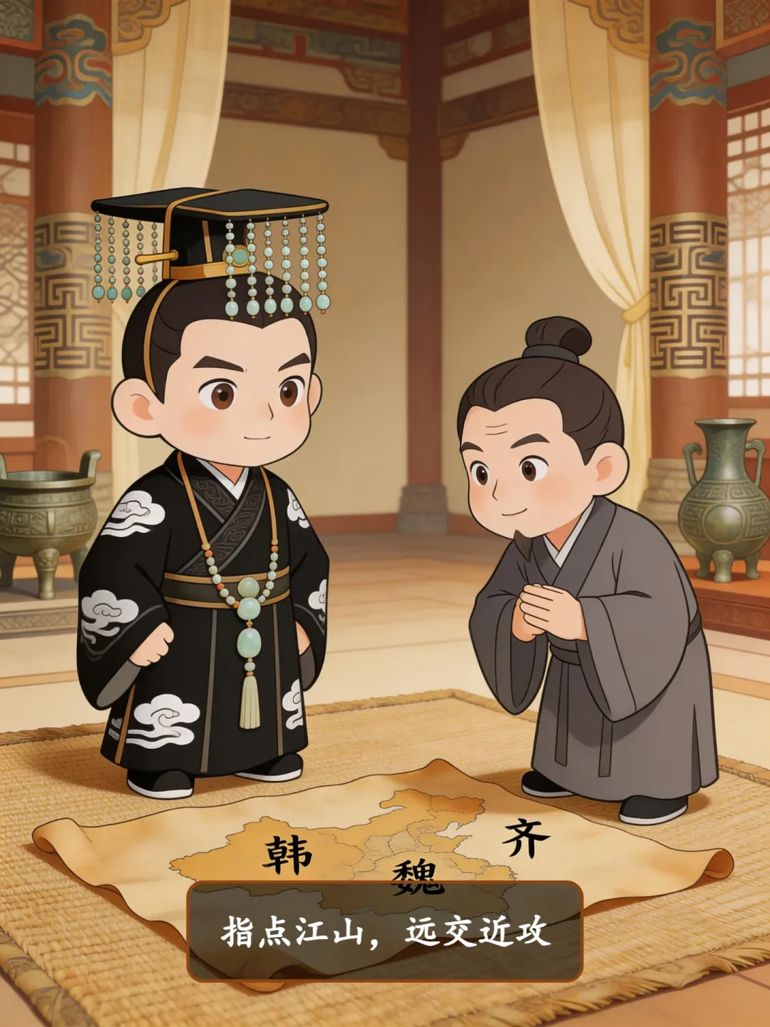 在离宫章台(今陕西西安西北),范雎终于见到秦王。他避开太后和穰(ráng)侯魏冉(rǎn)耳目,提出“远交近攻”策略:结交远方齐国,集中攻近邻韩魏,如蚕食桑叶般扩土。秦王茅塞顿开,立刻拜范雎为客卿,参与军国大事。