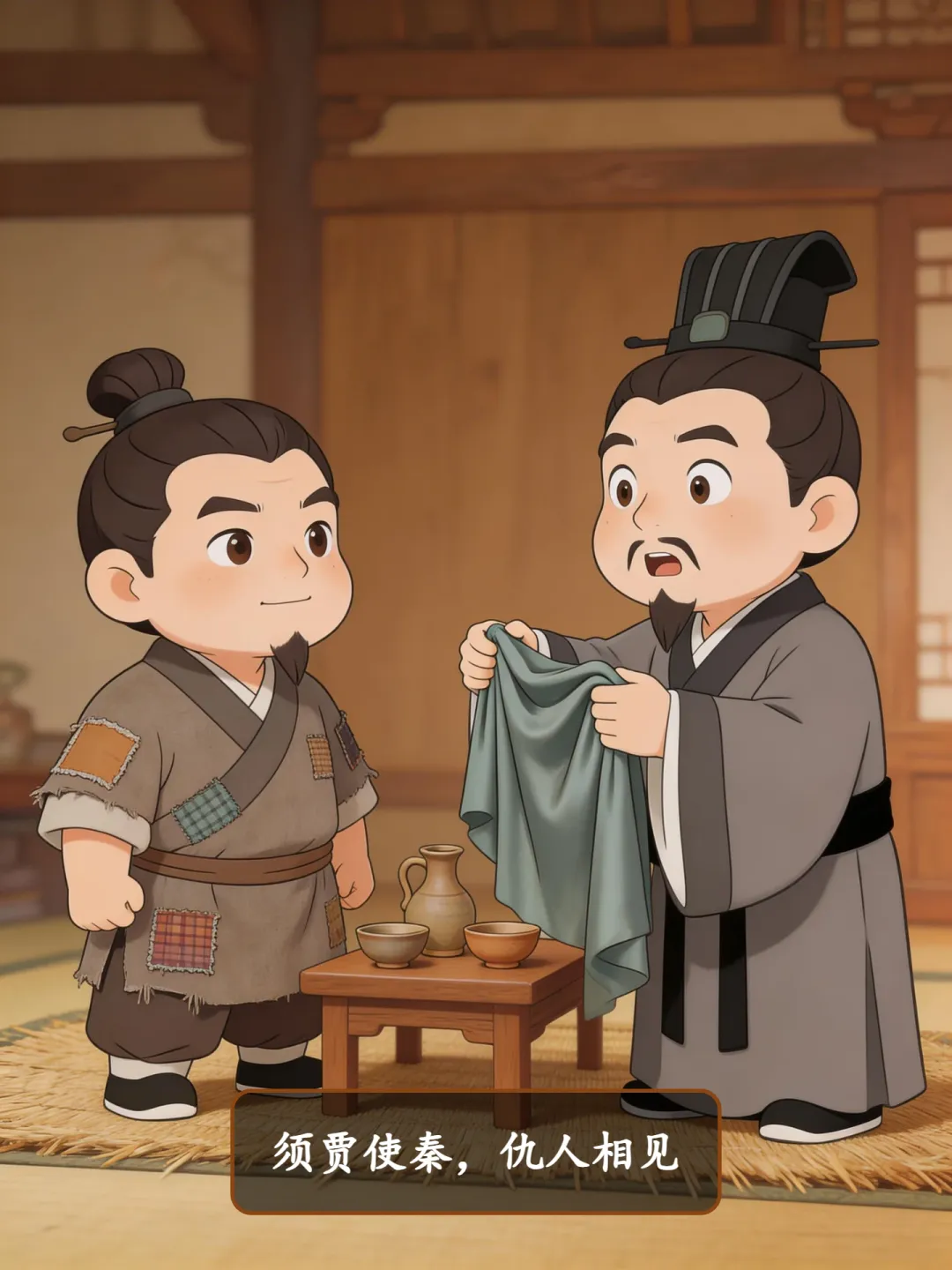 魏国闻秦要攻己,吓坏了,派须贾出使秦国求和。范雎闻仇人至,决定戏弄。他换上破衣,步行到客馆见须贾。须贾大惊:“范叔,你还活着?怎如此落魄?”范雎佯装凄惨,须贾感慨,赠厚绸袍子(绨袍)御寒。