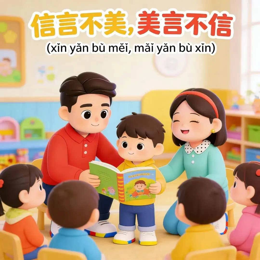 亲子互动小技巧:和宝宝玩“真话假话小判断”游戏,和宝宝分享一些简单的话(如“我有一个会飞的玩具”“我们一起搭积木吧”),让宝宝判断哪些是实在的真话、哪些是华丽的假话;再和宝宝一起读两本封面和内容反差大的绘本,让宝宝在实践中理解“信言不美,美言不信”的道理,培养真诚实在的好习惯。