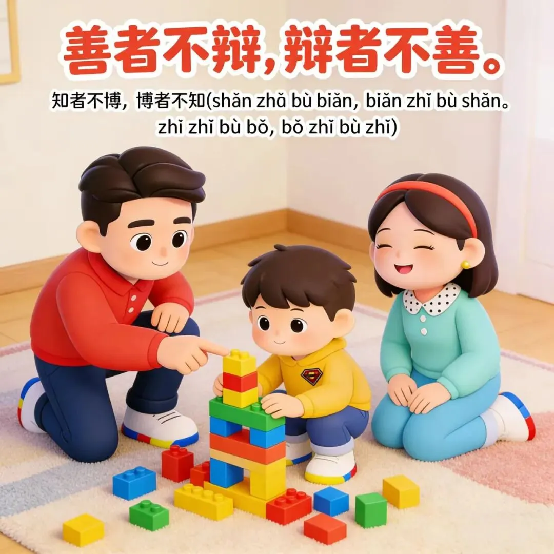 场景2:善良的人不会去争辩,爱争辩的人往往不善良。真正有智慧的人不会追求表面的广博,追求广博的人往往不是真正有智慧。爸爸没有直接帮小篮球搭好积木,而是教会他方法,这才是真正的帮助。