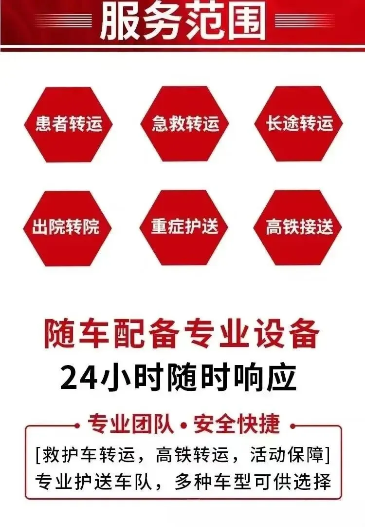 我们是120救护车出租转运服务公司,我们家的业务有出租转运、120急救转运、跨省转院、出院转院等等,我们都可以做。只要是转院病人,就可以找我们。我们家可以直接电话预约,特别方便。您只需要给我们打个电话,我们最快15分钟就可以出车。接上了病人就直奔目的地走。我们家收费标准也是明明白白的,绝对不绕弯路,不坑人,家属们。放心吧。