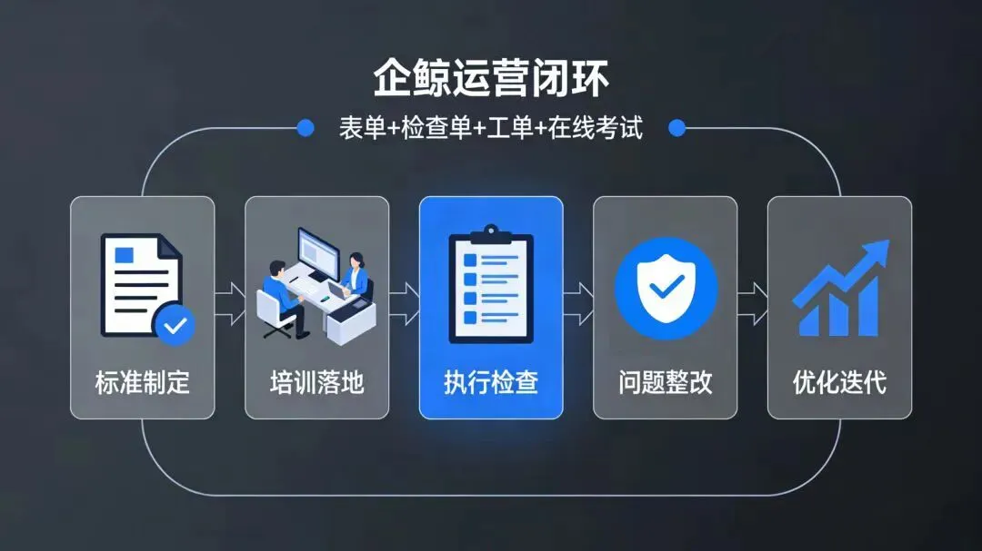 企鲸的 “表单 + 检查单 + 工单 + 在线考试” 功能矩阵,刚好能串起完整的运营闭环: