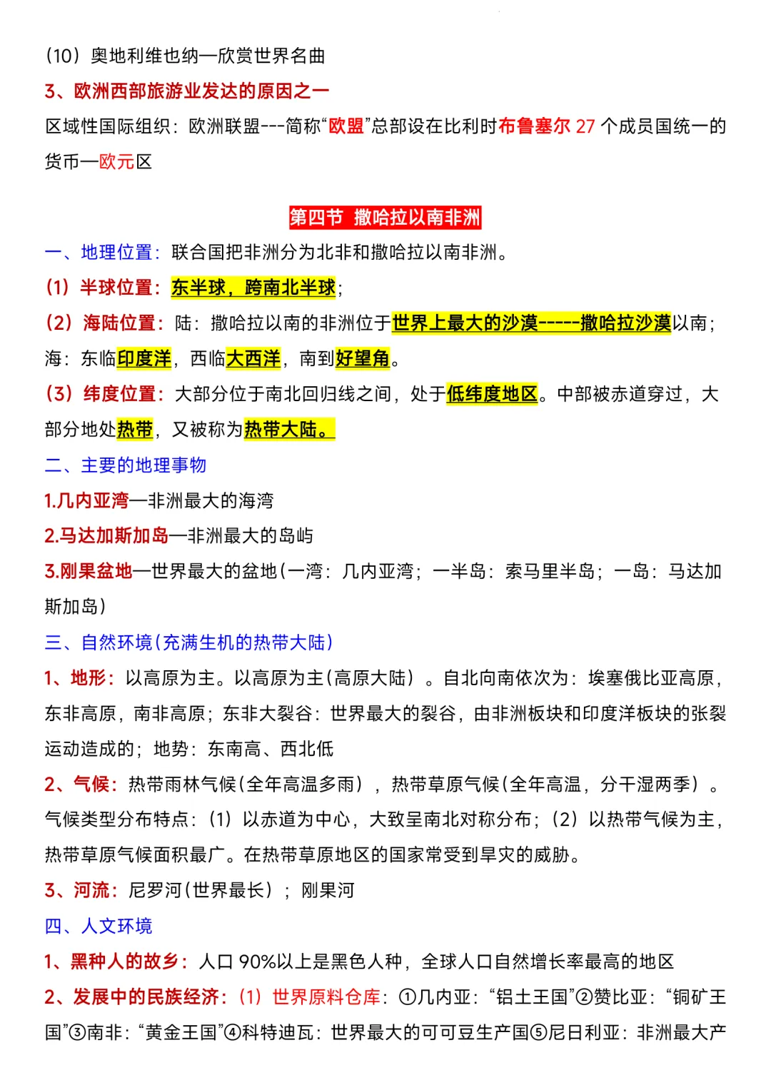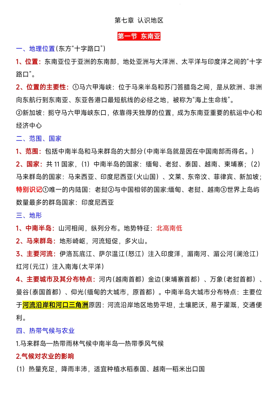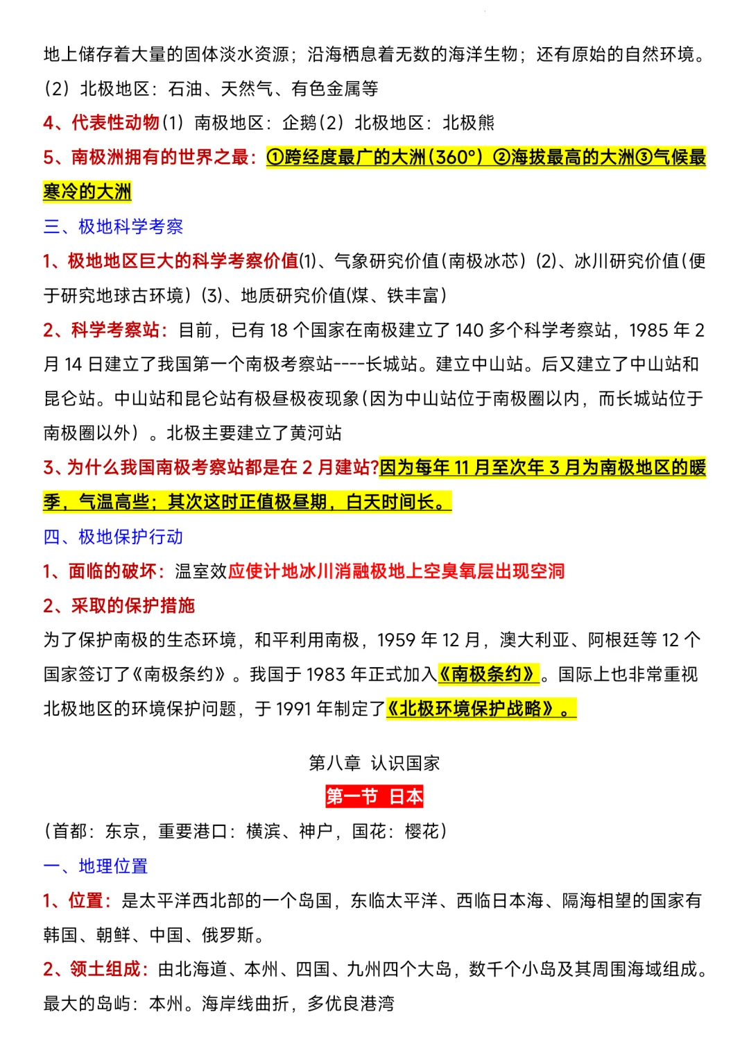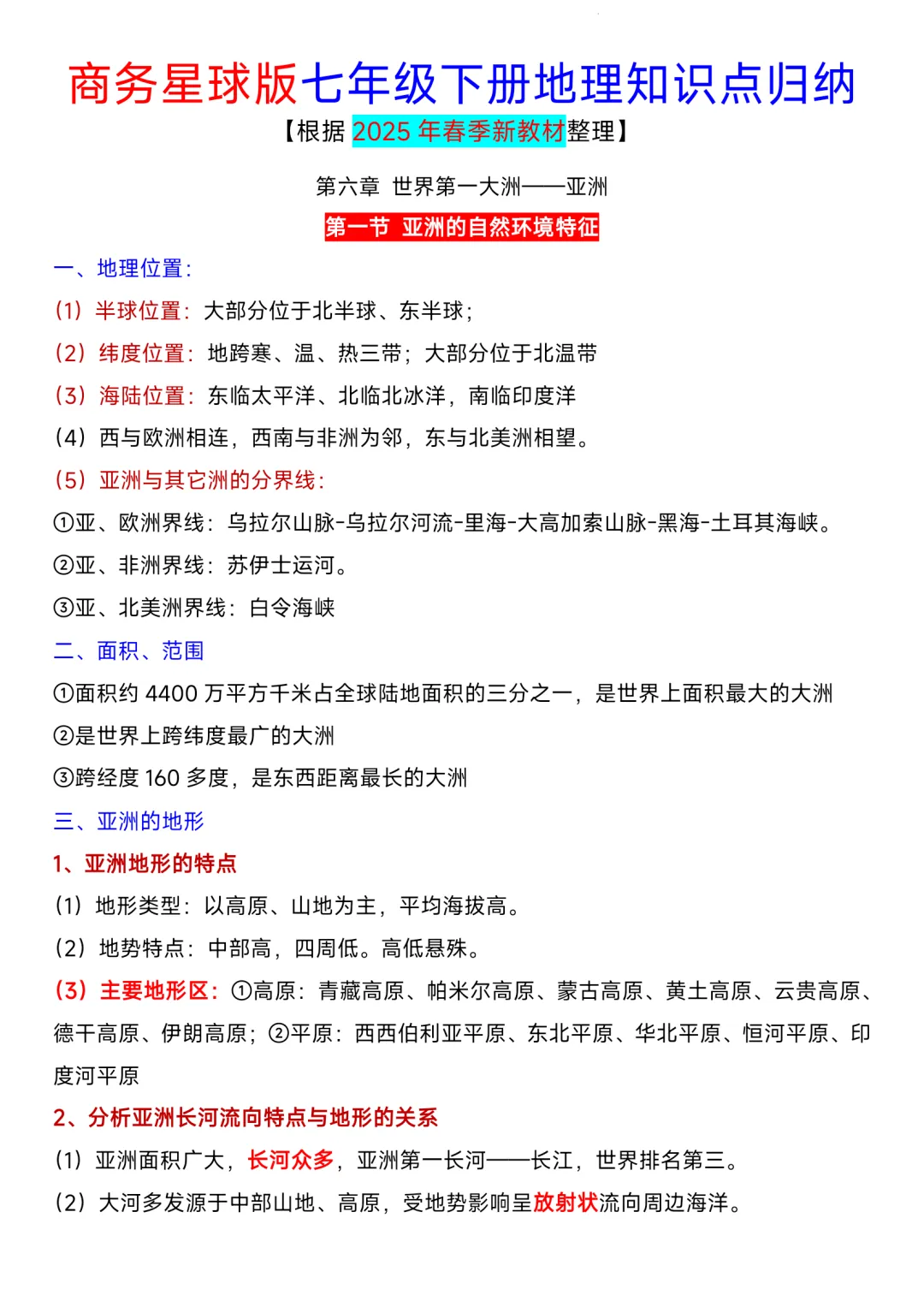 2026年最新版商务星球版七下地理知识归纳,有完整电子版可打印,学霸学习好帮手,建议家长打印,学霸人手一份!