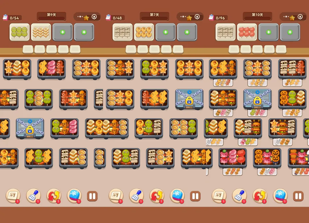 ✅ 操作:点击相同烤串→快速消除;用道具(铲子 / 刷新/+1/时间)辅助游戏