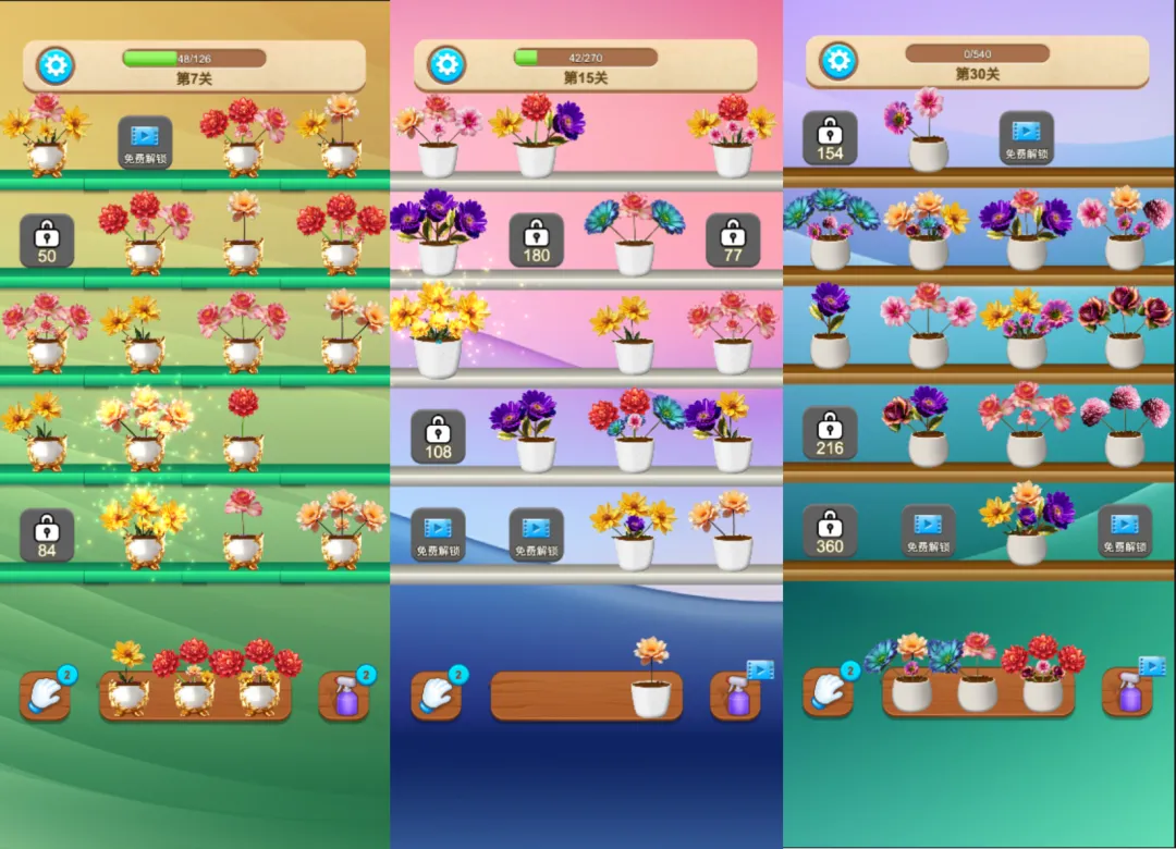 介绍:游戏中,玩家可以通过长按拖动底部的花盆到网格中,松开手指后,花盆会自动与下落上下左右相邻的花朵颜色相同,会自动交换位置;当一个花盆上的所有花朵颜色相同,就会消除,获得积分;当游戏中没有可消除的花盆,游戏就过关;
