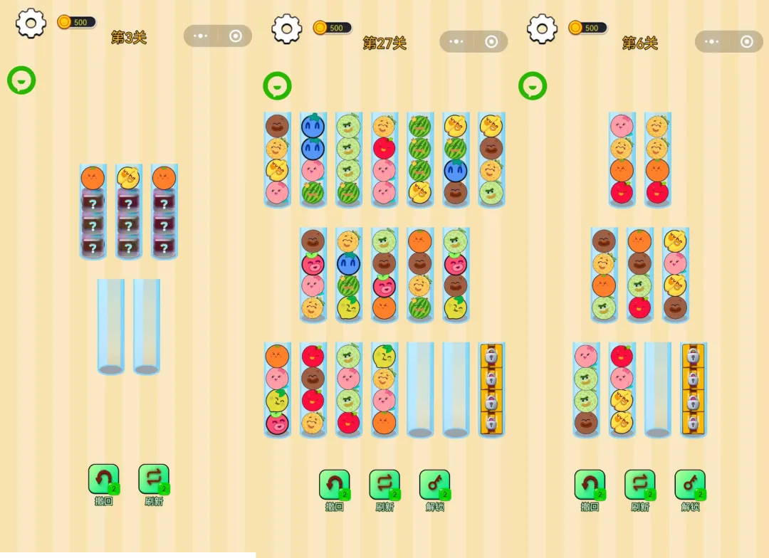 介绍:玩法简单,将所有水果分类排序即可完成游戏关卡;水果表情是动态的,给玩家提供丰富的情绪价值。