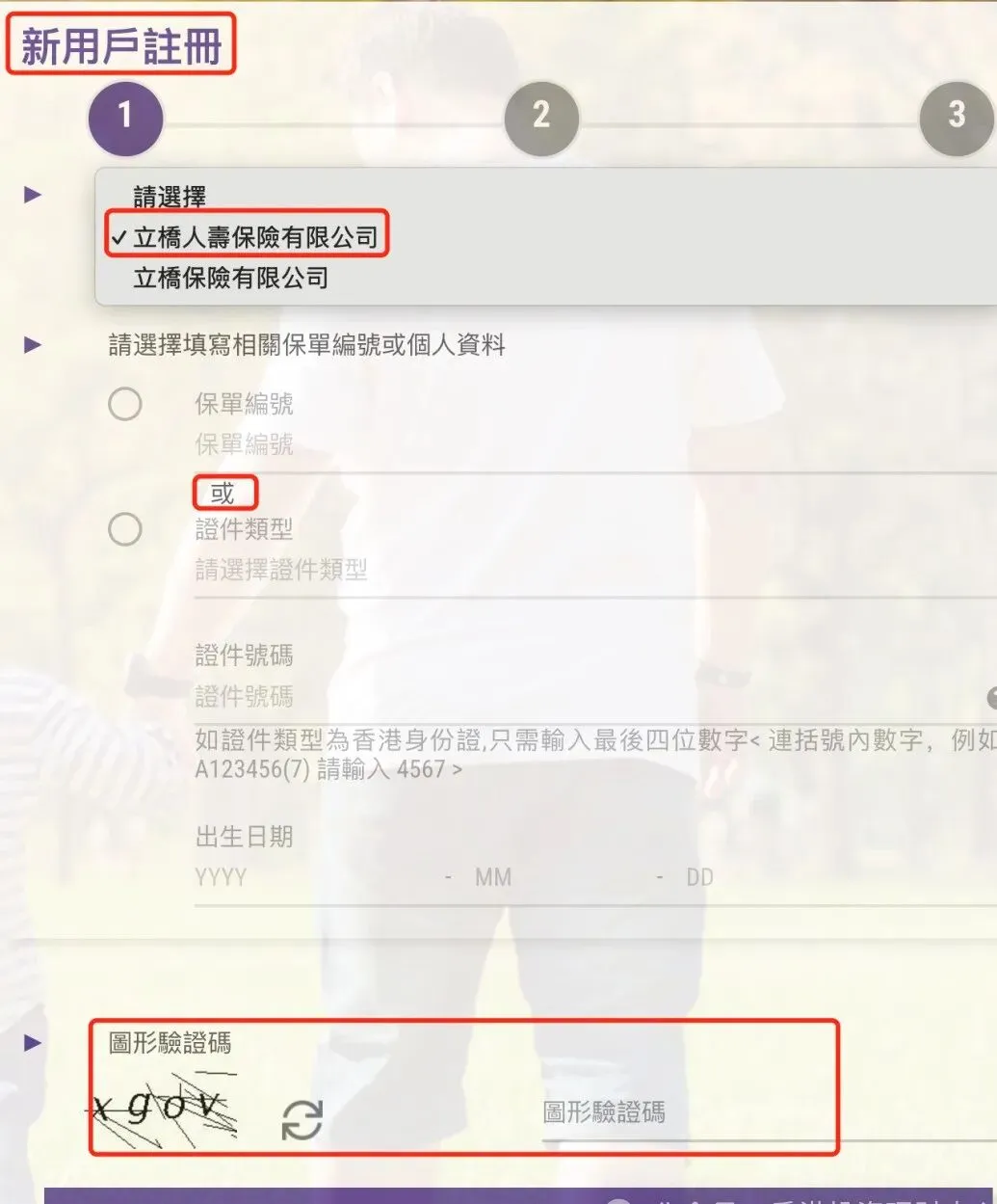 “新用戶註冊”,在”承保公司”選項中選擇“立橋人壽保險公司”,輸入“保單編號”或選擇證件類型”輸證件號碼”,輸入“圖形驗證碼”