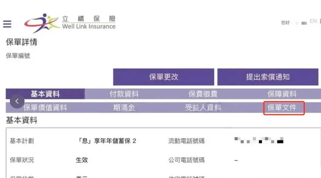 登錄後,點擊“詳情”查看保單信息。進入“保單文件”頁面,可以查看和下載電子保單及收據