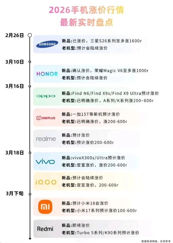 这轮涨不是某一两款的热度起落,是老款也在往上调,是品牌一起跟,是线上线下一起推,是近五年少见的普涨节奏,OPPO一加vivo先发声,千元段、中端段、主打性价比的版本一起上调,单机上涨300到1000,比例能到10%到30%,荣耀这边不少版本悄悄调,配置款直接下架,想买的得换规格,小米和华为表面咬着,活动少了,到手价抬上来,用户最直观的感受就是,原来2000的预算,现在多出三五百才够接近以前同水位,盯着的老款没见便宜,反倒一天一个价更高。