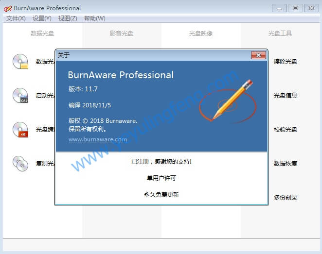 资源仅供测试,如需长期使用请前往官网购买正版支持开发者,目前BurnAware Professional有免费版本以及付费版本供用户使用,免费版本限制了部分功能但是依旧比同类工具强悍不少。目前几乎大部分笔记本都没有预留光驱盒毕竟使用频率不是很高,买个外置光驱盒或者使用台式机也是一样的。
