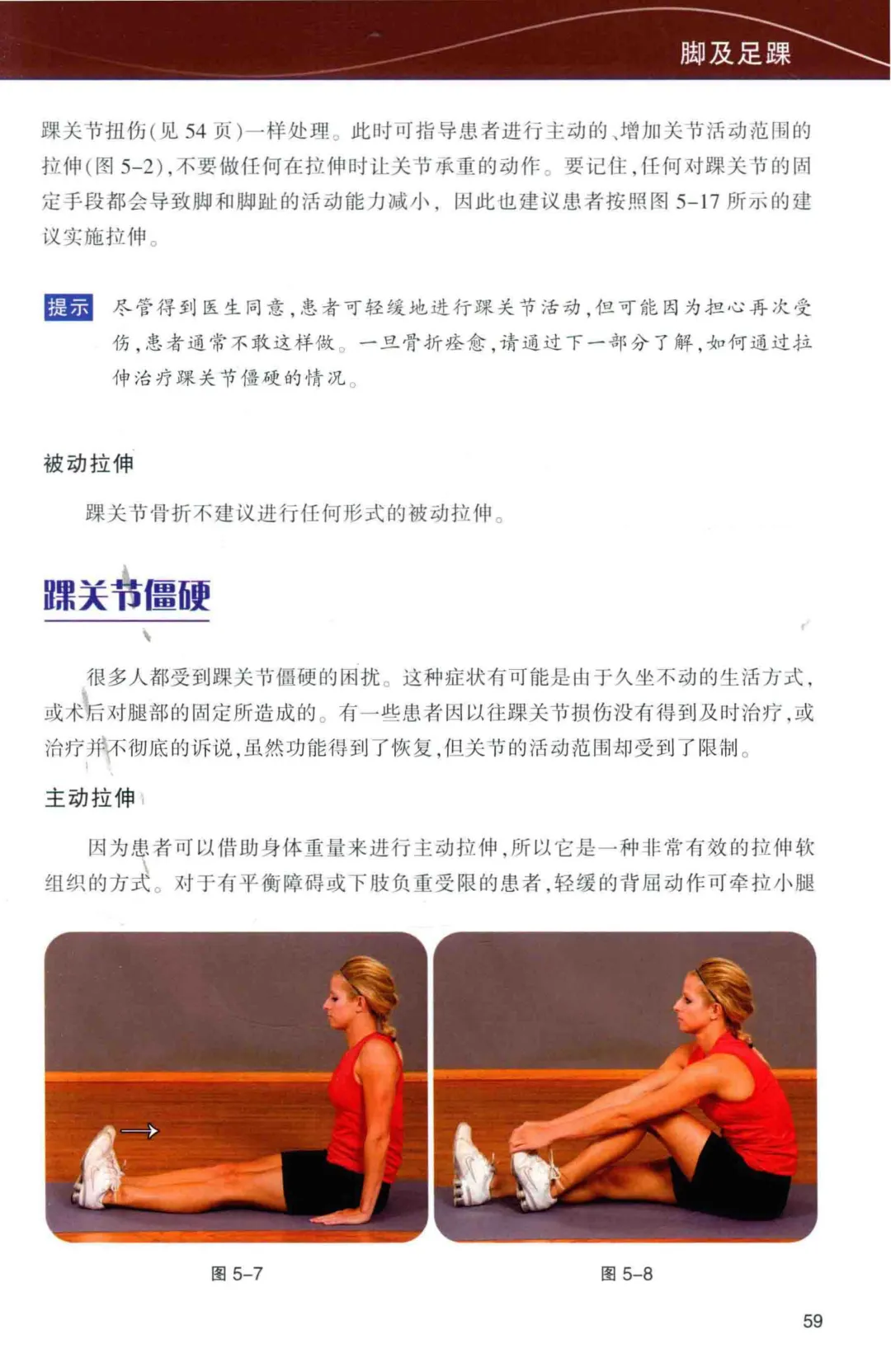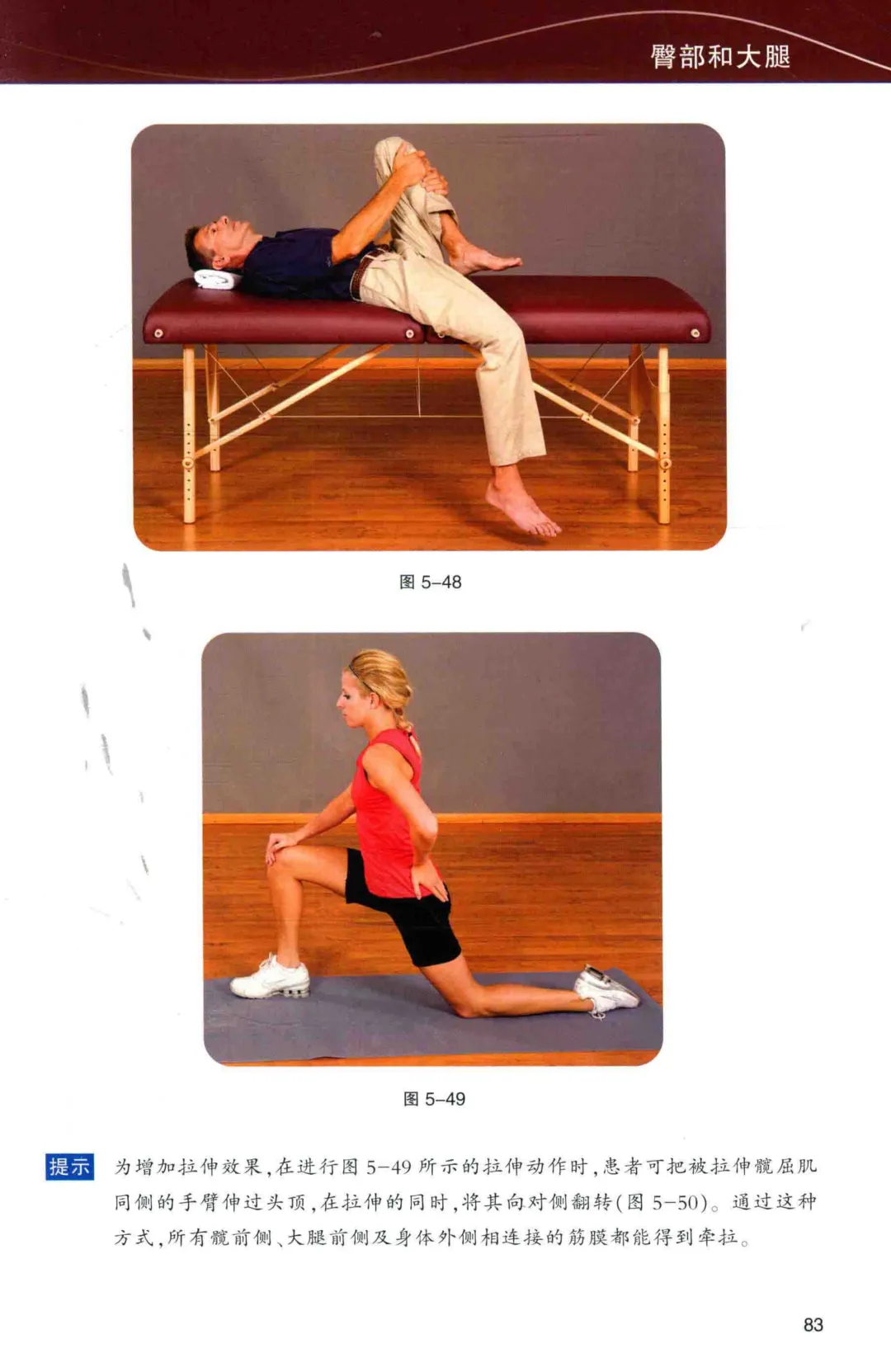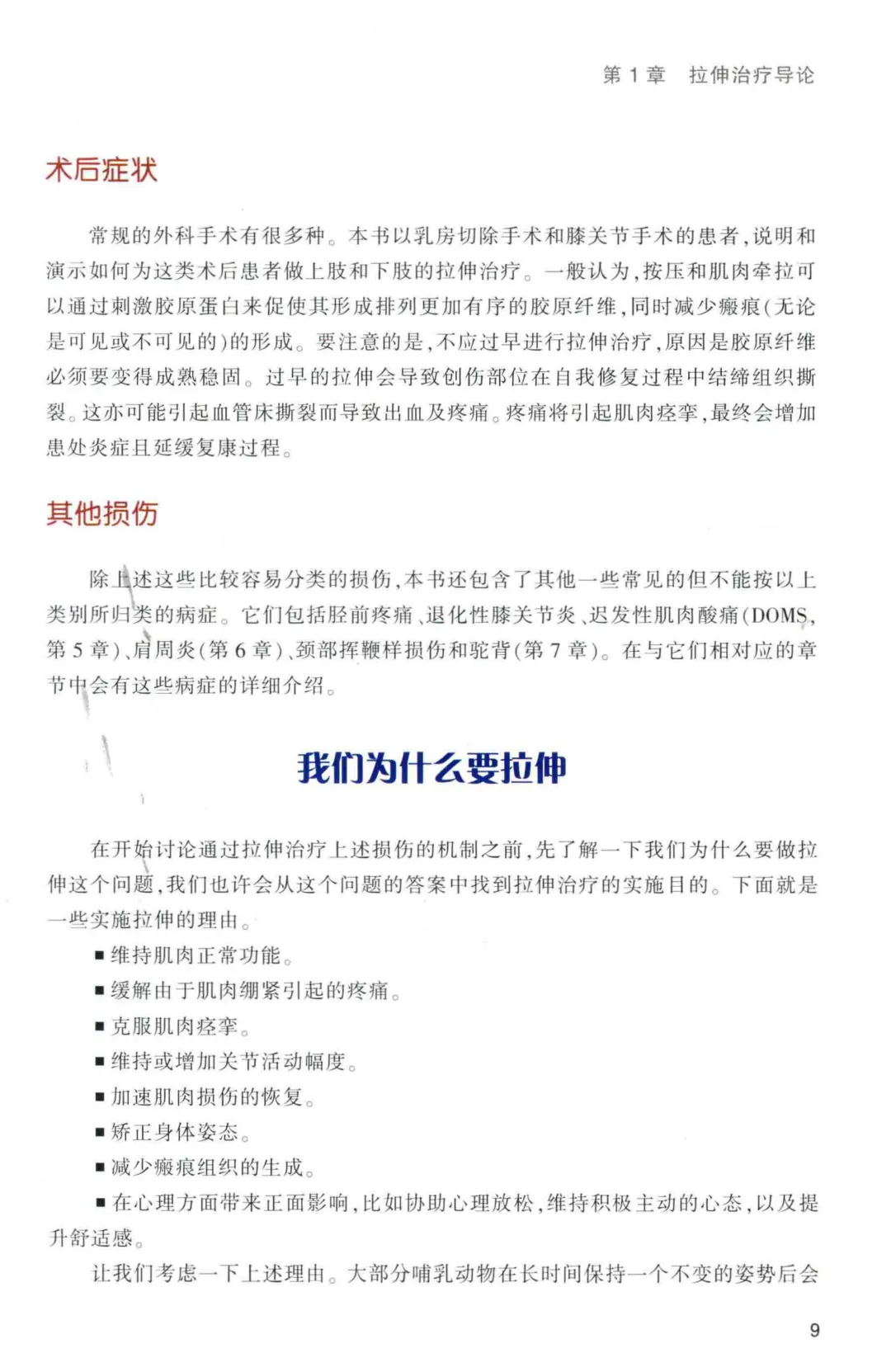 它详细阐释如何将各种拉伸技术应用于常见的肌肉骨骼系统损伤与病症的康复过程中,如肩袖损伤、下背痛、腘绳肌拉伤、足底筋膜炎等。
