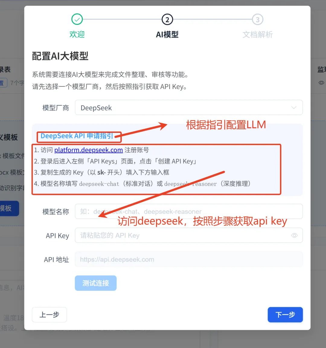 这个系统本身不自带AI,它需要连接外面的AI大模型来干活。你要做的就是:去AI厂商那里注册一个账号,拿到一把”钥匙”(API Key),然后把钥匙填进系统里。