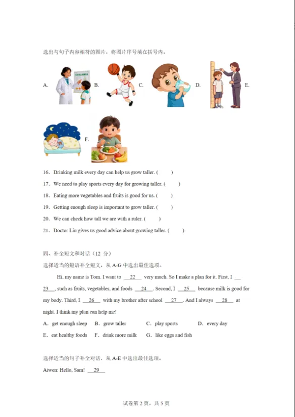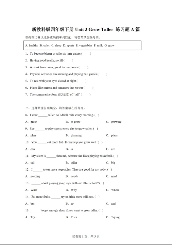 2025-2026学年教科版英语四年级下册 Unit 3 Grow Taller(同步练),PDF,可下载打印