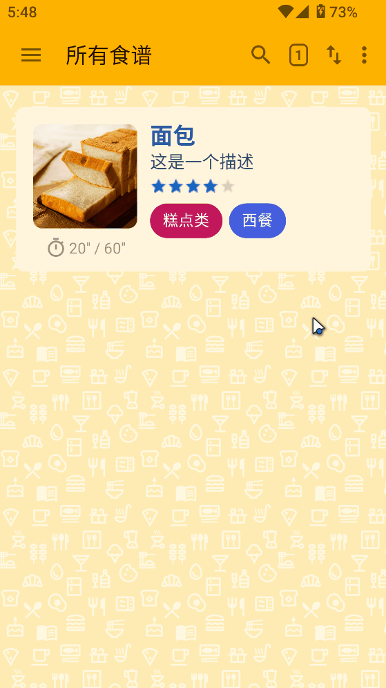 一款用于记录和管理做饭、烘焙食谱的应用,可以在手机上整理自己的菜谱内容,方便查找和使用。