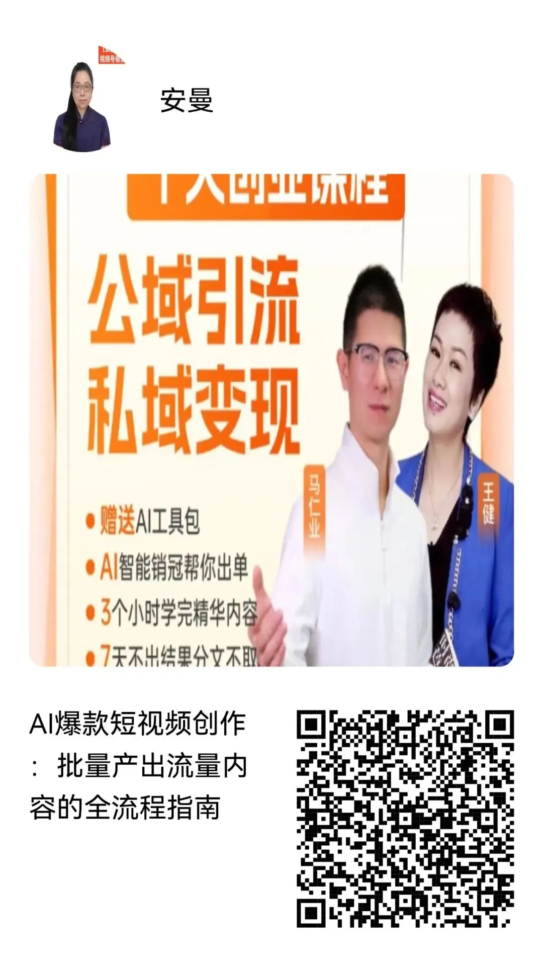 这是马仁业老师主讲的AI营销课,3小时教你用AI搞定公域引流和私域变现,送工具包,7天无效还能退款,特别适合创业者。