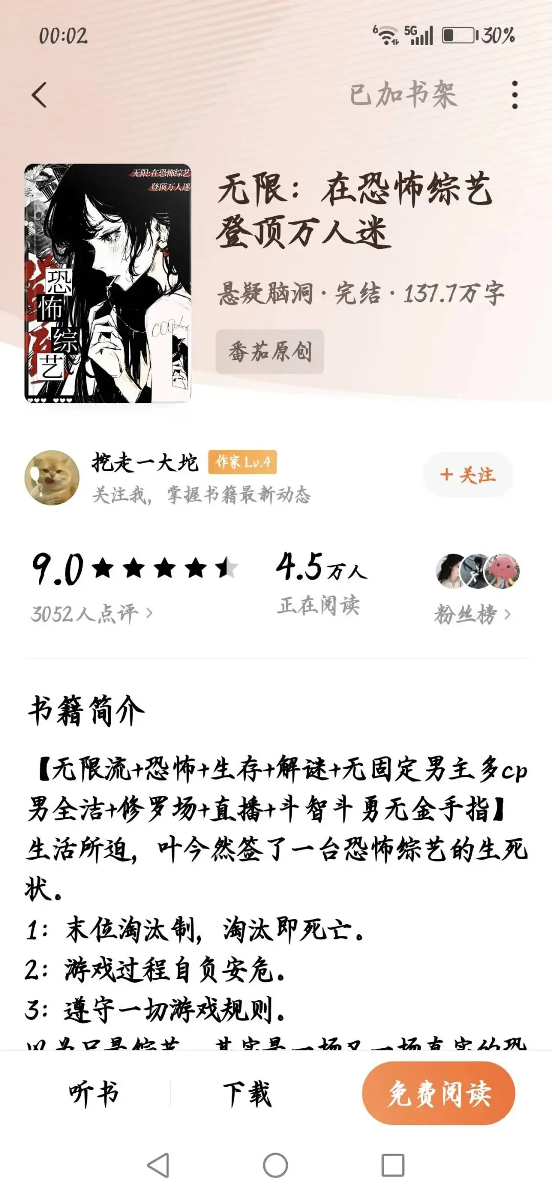 《我背着恶鬼在生存游戏里大杀四方》,作者陌肆白,在🍅,多福小镇和蚁沼村比较好看(个人很喜欢民俗类恐怖)。这个作者的《今天你成功入住生存旅店了吗》也超级好看,是我喜欢的群像文,我特别喜欢的就是他们闯关成功住的地方就会升级,从大通铺到旅馆,从旅馆到酒店。会有一点点配平文学,我个人很喜欢磕cp,所以不讨厌配平,男主前期是只猫。最喜欢里面的444号公寓和神仙妻。