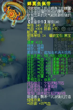 下面这件140级的腰带,不仅能为玩家在任务还是PK中,都能带来更多的生存空间,因为它有着愤怒特效的同时还带有吸血特技,这技能可以对敌对方使用后造成当前气血百分之20的伤害,同时回复自己的血量,在属性上也是有着304点的气血以及78点的防御力。