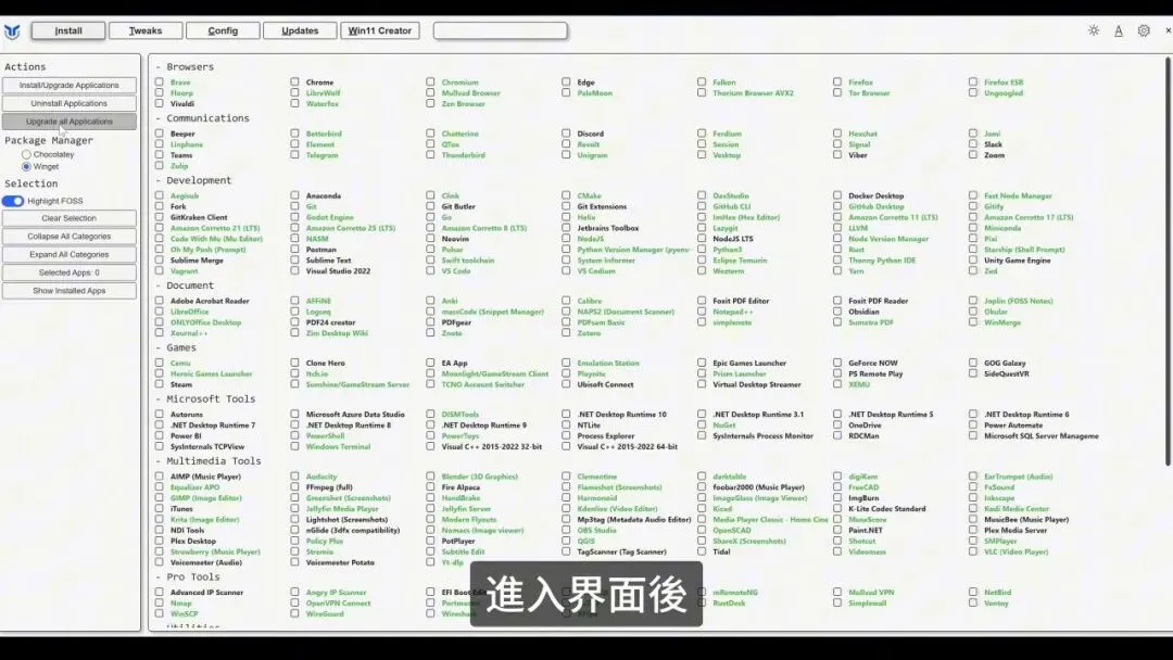 在这个标签页里,Winutil 提供了海量软件库,分类涵盖: