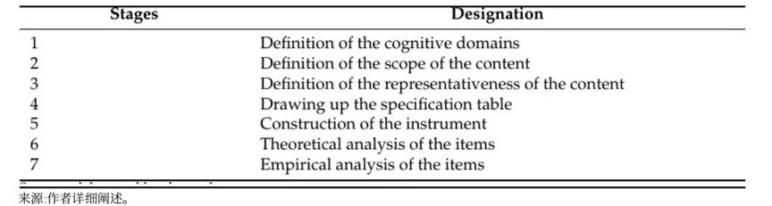 在为 ALCE 仪器的开发收集基于测试内容的效度证据过程中,研究团队借鉴了 Pasquali 提出的阶段划分,具体如下表1所示: