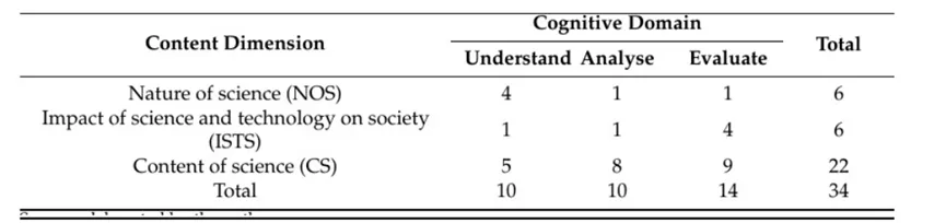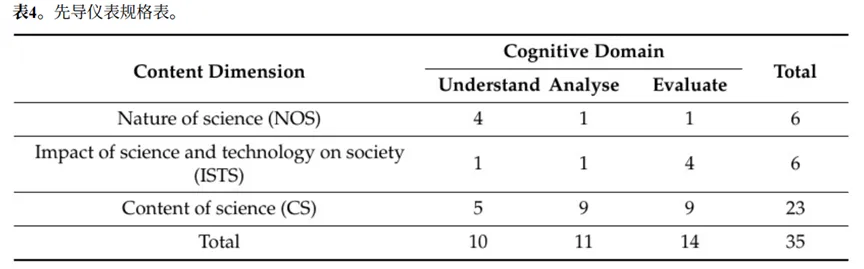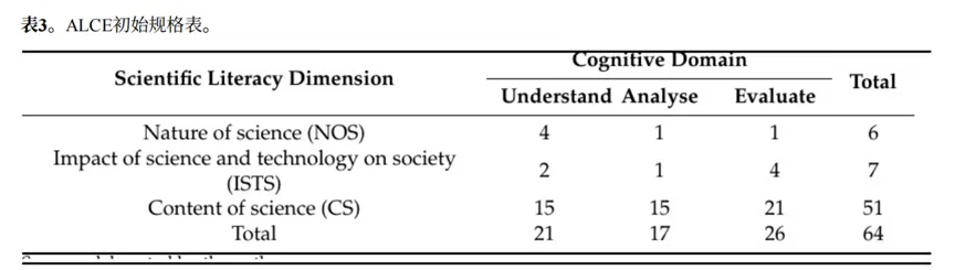 ALCE 仪器的初始规范表将科学素养的维度与认知领域相结合,并明确了每个领域的题目数量。如下表3所示,在 64 个题目中,理解领域 21 项、分析领域 17 项、评价领域 26 项。
