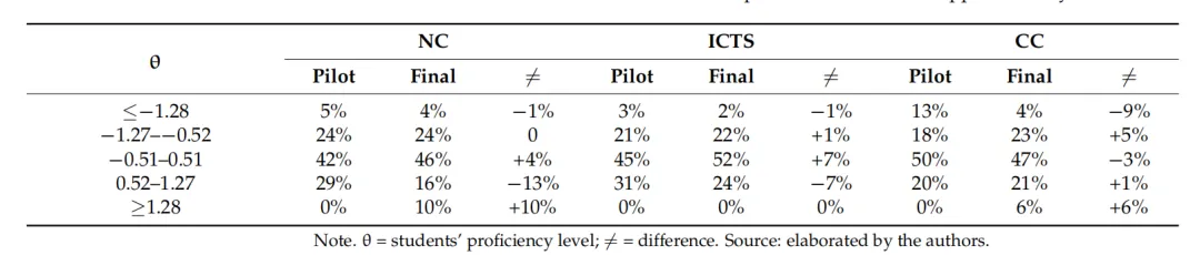 对比试点测试和最终应用中学生θ水平的分布情况(如下表6所示),并结合本研究规定的难度水平,可以发现结果较为相似。值得注意的是,在 NOS 和 CS 子测试中,最终应用中θ等于或大于 1.28 的学生比例分别增加了 10% 和 6%;而在 ISTS 子测试中,θ 在 0.52 到 1.27 之间的学生人数下降了 7%。
