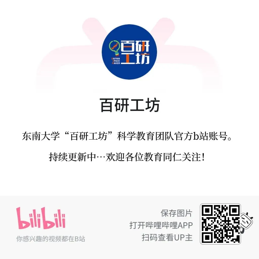 东南大学百研工坊:21世纪是我国创新型人才培养的关键期。东南大学百研工坊(儿童发展与教育研究所)是国内从事科学教育研究的专业团队,结合教育学、心理学、认知科学和现代信息技术,开展面向基础教育阶段的科学教育研究,包括:青少年科学教育、STEM教育、人工智能教育和科学素养评价研究,希望与广大科学教育工作者一起努力,为我国科学教育事业的发展做出贡献!