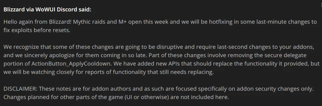 根据暴雪修复这些改动的时间,部分插件作者可能需要花时间更新他们的插件。如果您的插件在本周出现故障,请体谅您的插件作者,他们可能正在尽力修复这些紧急改动带来的问题。