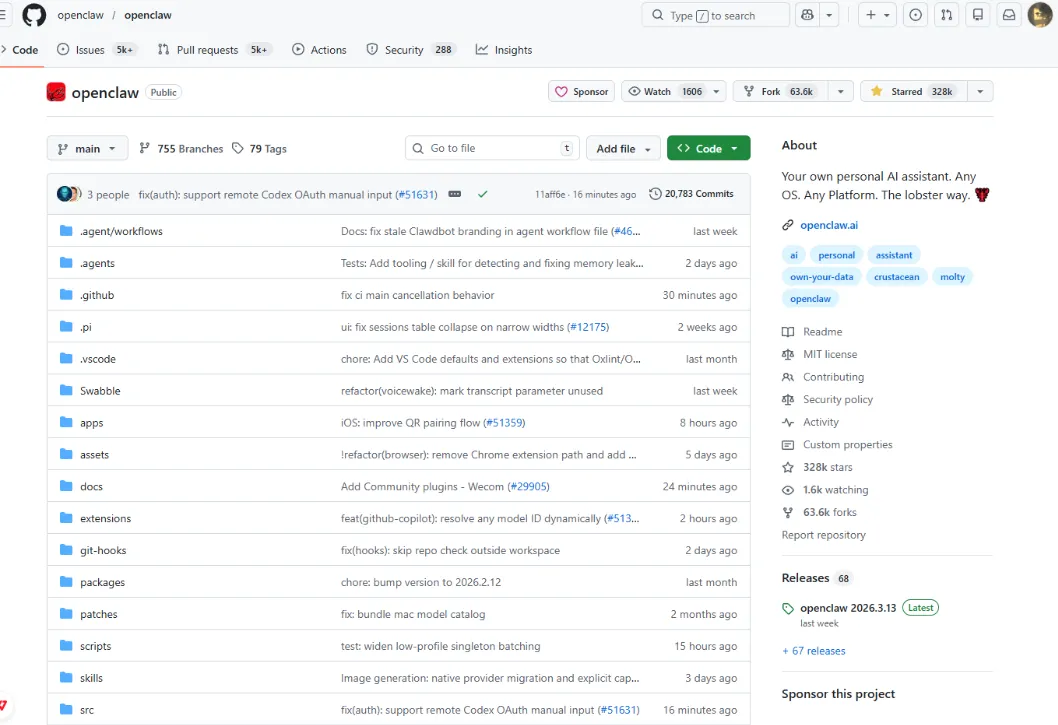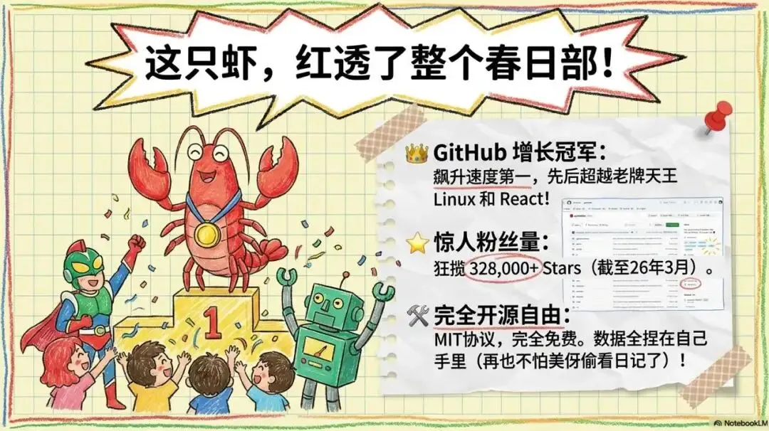 登顶github第一,超越Liux,2025年11月项目提交,经历ClawBot–》MotBot–》OpenClaw,截至20260321:328000star