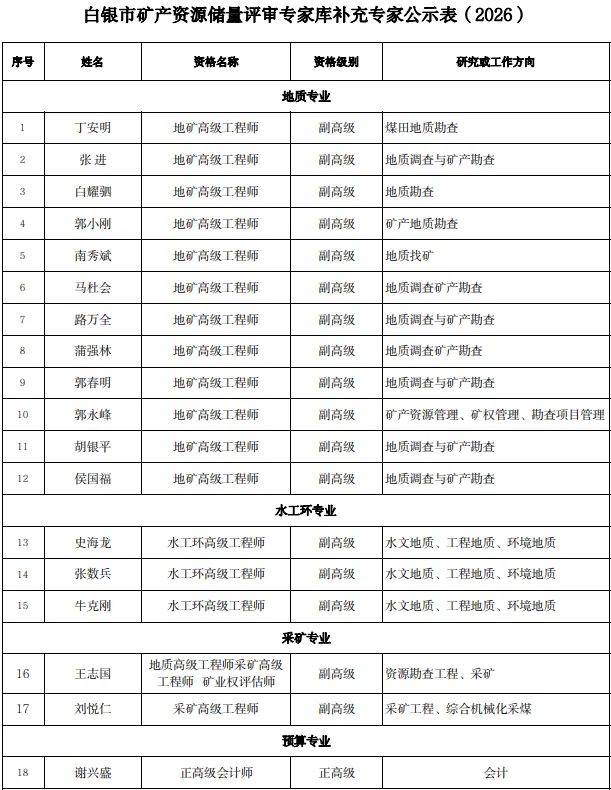 关于2026年度补充白银市矿产资源储量评审专家入库专家的公示