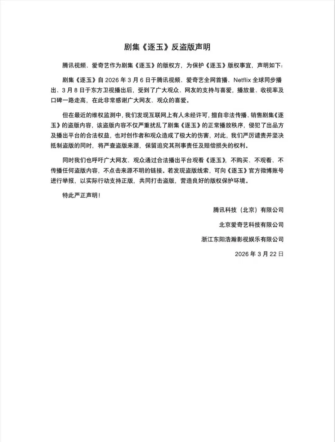《逐玉》平台那边刚播到30集,结果21日,包括大结局在内的后面10集遭遇大规模泄露,目前高清原版在各大平台流通,网盘资源、二手群到处都是相关资源,视频上标有271水印,显然是从271这边流出去的,目前鹅厂已经去追问271泄露的责任。虽然《逐玉》这部剧虽然有注水的争议,但整体来说达到了热播的标准,是有点成绩的。平台方面就想要拖一拖,单更可以把这部剧的长尾效应给搞起来,但是一来很容易出事,一天一集把观众整得急眼了,遇到盗版资源也就蜂拥而上,以至于资源泄露这件事情发展到了目前这种地步。