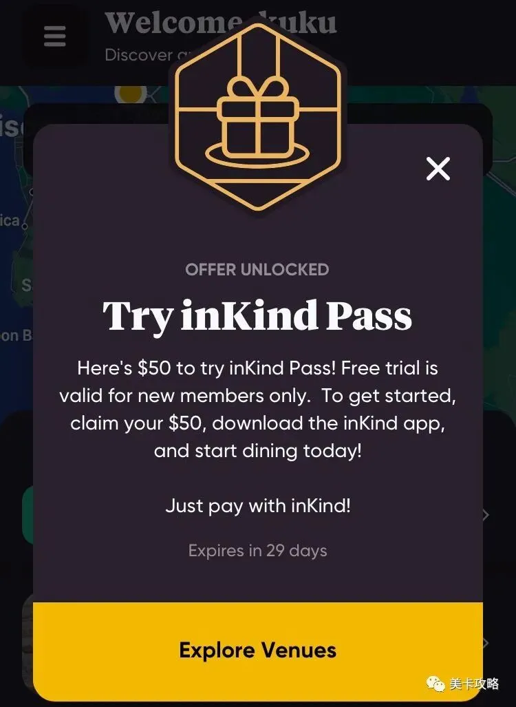 叠加这个 inKind Pass 试用,可以再获得 $50,即使你没有Amexoffer,总计也能拿到$75,应该可以免费吃一顿?如果有至少一个Amex offer,就是白拿$125了。